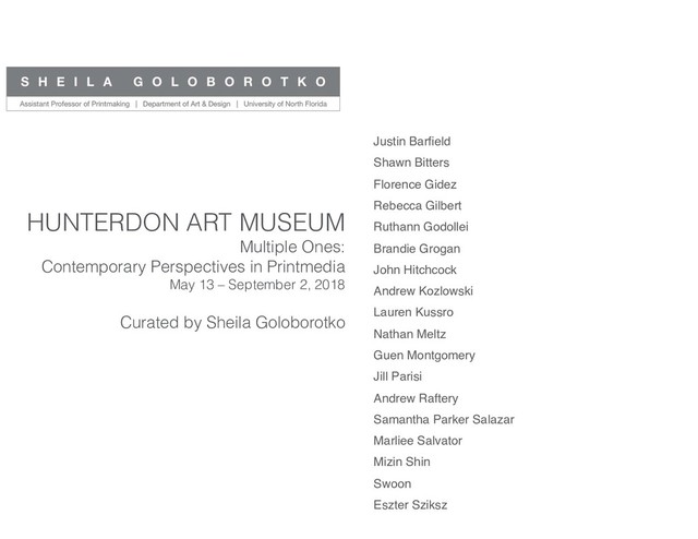 and contemporary pulse to Printmaking that is taking the art world by surprise. This medium has for centuries been associated with the making of flat, editioned images—mostly on paper—using specific equipment and printing elements, also known as “matrixes." Printmaking is more than that; it is, in its essence, as visual artist Päivikki Kallio (2015) describes, a collective process in which each part shares equal importance: the inks, the matrixes, the paper, the equipment, and the print. The final proof and the editioned prints are—as all other elements—an equal part of this collective. It is utterly democratic, as it has the potential to create numerous original prints that can be widely distributed. However, with the development of the digital cosmos, the potential for editioning and multiplication has become meaningless and at times nostalgic; nowadays, everything can be transmitted and shared on multiple platforms, numerous times. The eighteen contemporary printmakers in this exhibition are less concerned with printing editions and more interested in multiple originalities. They have removed the artificial boundaries around printmaking to really understand the process and have contextualized printmaking also as a participatory, rather than only a democratic process. Here is a technique that is so porous, it can act like a sculpture and inhabit three dimensions; it can mimic a painted mural as it sprawls across a wall. What’s more, its materiality is astounding. The prints in this exhibition are on porcelain, recycled wood, and melting ice; they live in the toxic residue left by the contaminated water of Flint, Michigan, and are even inked onto good old fashioned paper—only sideways, on the paper’s, less-than-millimeter thick, bleeding edge. They hang frameless, flexible, folded, and are built like a puzzle or planted as a garden. They are ethereal, unearthly, or oxidized— created by the oxygen both you and I breathe. Some are architectural; others are biological. Some occupy the physical space, others a limited state or temporal transition. Every work in this exhibition was originated from one or more printing elements, either physical matrixes or digital vectors. Prints were all somehow manipulated—cut, folded, burnt, fired, mounted, recorded, or pasted. All these actions reveal the innate familiarity printmakers have with matters of time, space, gravity, and pressure. Diversity is the watchword here, yet all these artworks do have one thing in common: they form an open-ended mode or a network of nomadic relationships among all elements in the collective printmaking process. Each piece is a unique art object, less concerned with Printmaking’s legacy as "edition" than it is inspired by its amazing ability to be both “original” and multiple at once. We live in fast-paced society, and in trying times. Prints can help us embrace the unique essence that dwells amidst diversity, the Unity that comes from embracing a world seen from countless points of view. Sheila Goloborotko, 2018