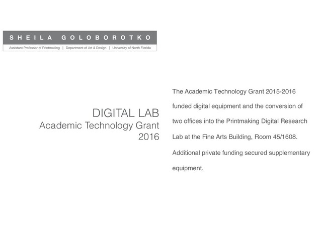 Technology Grant $1,800.00 Art Department (10% AT Grant) $200.00 TOTAL: $4,500.00 Unforeseen expense due to new classroom / change of code Horn/Strobe Device (paid by donor’s fund) $2,007.90 ! Available funds $2,429.13 ! - HP DJ T120 24" $765.04 - HP LASERJET PRO M201DW Printer $182.88 - Plustek OpticPro A320 Tabloid Flatbed Scanner $429.99 - iMac 21.5-inch $1,339.00 2.8GHz Quad-core Intel Core i5, Turbo Boost up to 3.3GHz" - AppleCare Protection Plan for iMac $119.00 ! TOTAL EXPENDITURE $2,835.91 ! Additional Department Funds $406.78 Plustek OpticPro A320 HP DJ T120 iMac 21.5-inch - HP LASERJET PRO Printer Projector and screen installed Currently, students have the opportunity to create new works using the equipment purchased with the support of the ATG2015. ! In addition to digital equipment our digital projector and screen were installed in the Lab. Students and faculty are able to use the digital projector and video for lectures and presentations. ! In the past, faculty used a temporary solution of a projector and desktop installed in a rolling cart—a disruptive and uncomfortable routine. We were honored to receive a Fall 2015 ATG to purchase digital equipment for the Printmaking area on its initial steps in developing a state-of-the-art Printmaking Digital Research Lab where students and faculty are able to incorporate digital technology in the creation of contemporary prints. ATG 2015