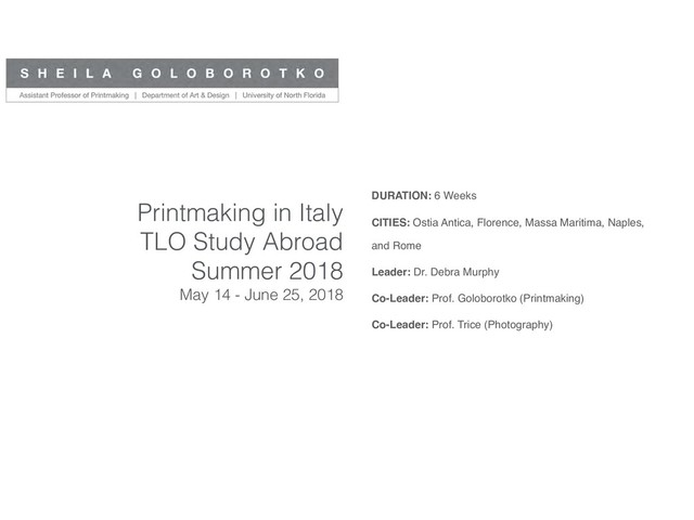 - June 25, 2018 DURATION: 6 Weeks CITIES: Ostia Antica, Florence, Massa Maritima, Naples, and Rome Leader: Dr. Debra Murphy Co-Leader: Prof. Goloborotko (Printmaking) Co-Leader: Prof. Trice (Photography)