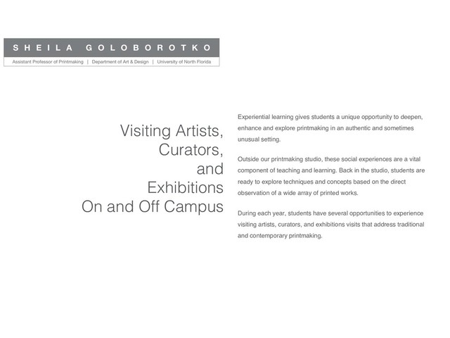 ! 12:00 – 2:50pm ! Screen techniques and Processes! 3:00- 4:00pm ! Potluck: Sweets and Snacks!! 4:00 – 6:00 pm ! Lecture: Prints, Zines and Books ! ! Mike Taylor uses prints, drawing, painting, and writing to create editioned folios and zines.! His organic marriage of text and imagery and anecdotal inclinations have carried throughout his career spanning two decades of screen printing, painting, drawing, editorial illustration, comics and zines published since the mid90s.! PRINTMAKING V I S I T I N G A R T I S T S S E R I E S E L L E N K N U D S O N D O N M A RT I N M I K E TAY L O R L O R R I E F R E D E T T E Tuesday, February 7, 2017 ! Visit from 6:00 – 10:00pm! George A. Smathers Library! Special Collections Book Arts, University of Florida, Gainsville! ! Students will view selected artists’ books that are part of the permanent special collections of George A. Smathers Libraries at The University of Florida. Guided by Ellen Knudson, Associate in Book Arts, students will be able to handle contemporary books including works by students making books in book arts and/or fine arts programs across the US. ! Ellen Knudson is a book artist and an Associate in Book Arts at UF. She holds an MFA in Book Arts from the University of Alabama. ! Tuesday, March 14, 2017 ! Demo Relief: 12:15 – 2:55pm! Demo Mokulitho: 3:05 – 4:50pm! 45/1603 Print Studio! ! Longtime resident of Northeast Florida, printmaker Donald Martin is devoted to the natural world. With his deft hand and immaculate graphic design sensibility, Martin creates block prints that explore various animal and plant forms found in the local ecosystem. In his prints, line, texture, color, and content illustrate his personal affinity for nature and present a view that is intimate, realistic, and close-up. His images are at once recognizable and abstract, organic and structured, naturalistic and graphic.! Thursday, April 6, 2017 ! Iterations: Gallery Talk at MoCA! 10:00 – 11am (Intaglio Class)! 1:00 – 2:00pm (Intro Class)! 4:00 – 5:00pm (Multiple Ones)! ! More than 2,000 smooth muslin-and- wax-covered pods comprise a cluster whose inspiration is nothing less deadly than the smallpox virus—a menace that ravaged millions. How long does it take to create a work of art? How quickly can an innocent population be decimated by illness? Lorrie Fredette has long been inspired by medical science and microscopic imagery. Iterations marks her third unique iteration of The Great Silence and it will be the most significant manifestation of it to date.! VISITING ARTISTS SERIES 2017