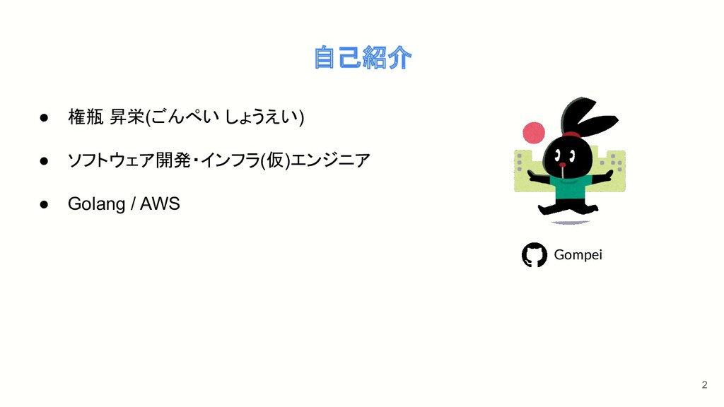 自己紹介 • 権瓶 昇栄(ごんぺい しょうえい) • ソフトウェア開発・インフラ(仮)エンジニア • Golang /