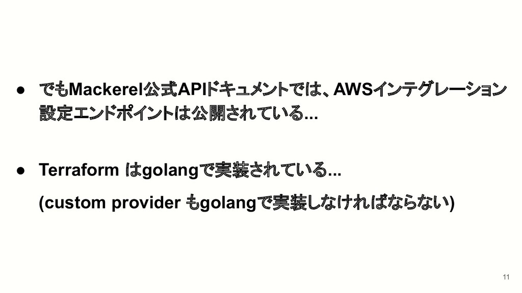 11 • でもMackerel公式APIドキュメントでは、AWSインテグレーション 設定エンドポイントは公開されている... • Terraform はgolangで実装されている... (custom provider もgolangで実装しなければならない)