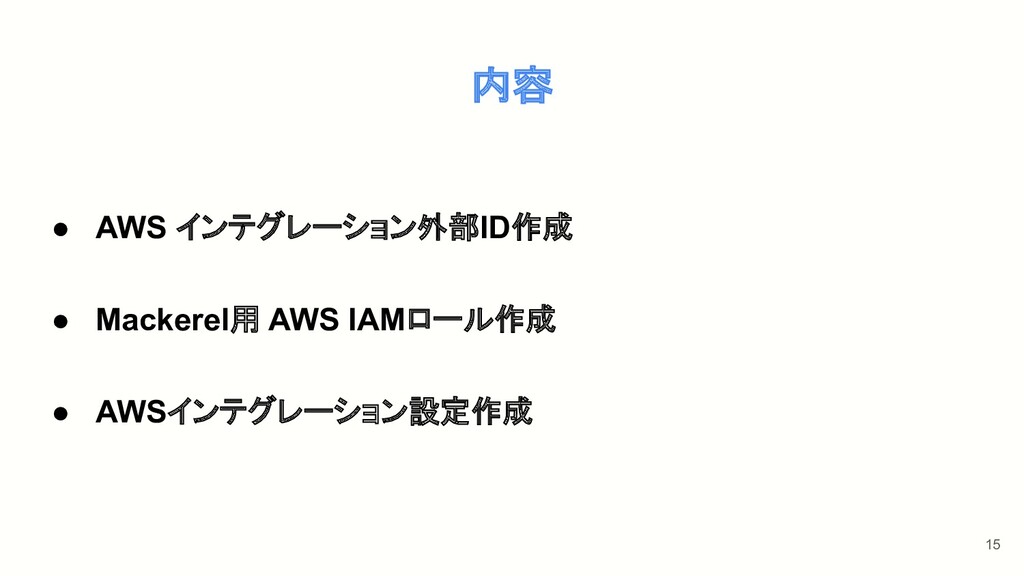 内容 • AWS インテグレーション外部ID作成 • Mackerel用 AWS IAMロール作成 • AWSインテグレーション設定作成