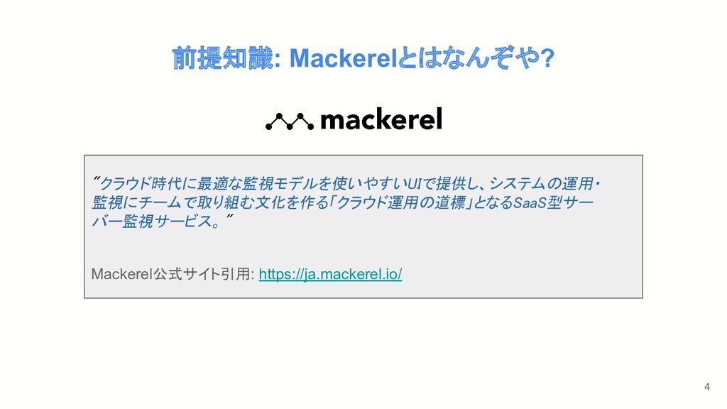 前提知識: Mackerelとはなんぞや? 4 "クラウド時代に最適な監視モデルを使いやすいUIで提供し、システムの運用・ 監視にチームで取り組む文化を作る「クラウド運用の道標」となるSaaS型サー バー監視サービス。" Mackerel公式サイト引用: https://ja.mackerel.io/