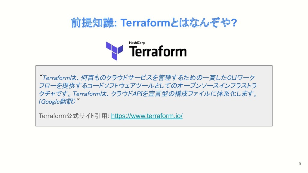 5 前提知識: Terraformとはなんぞや? "Terraformは、何百ものクラウドサービスを管理するための一貫したCLIワーク フローを提供するコードソフトウェアツールとしてのオープンソースインフラストラ クチャです。Terraformは、クラウドAPIを宣言型の構成ファイルに体系化します。 (Google翻訳)" Terraform公式サイト引用: https://www.terraform.io/