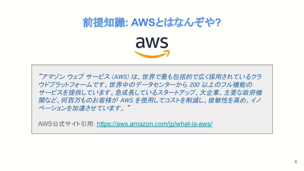6 前提知識: AWSとはなんぞや? "アマゾン ウェブ サービス (AWS) は、世界で最も包括的で広く採用されているクラ ウドプラットフォームです。世界中のデータセンターから 200