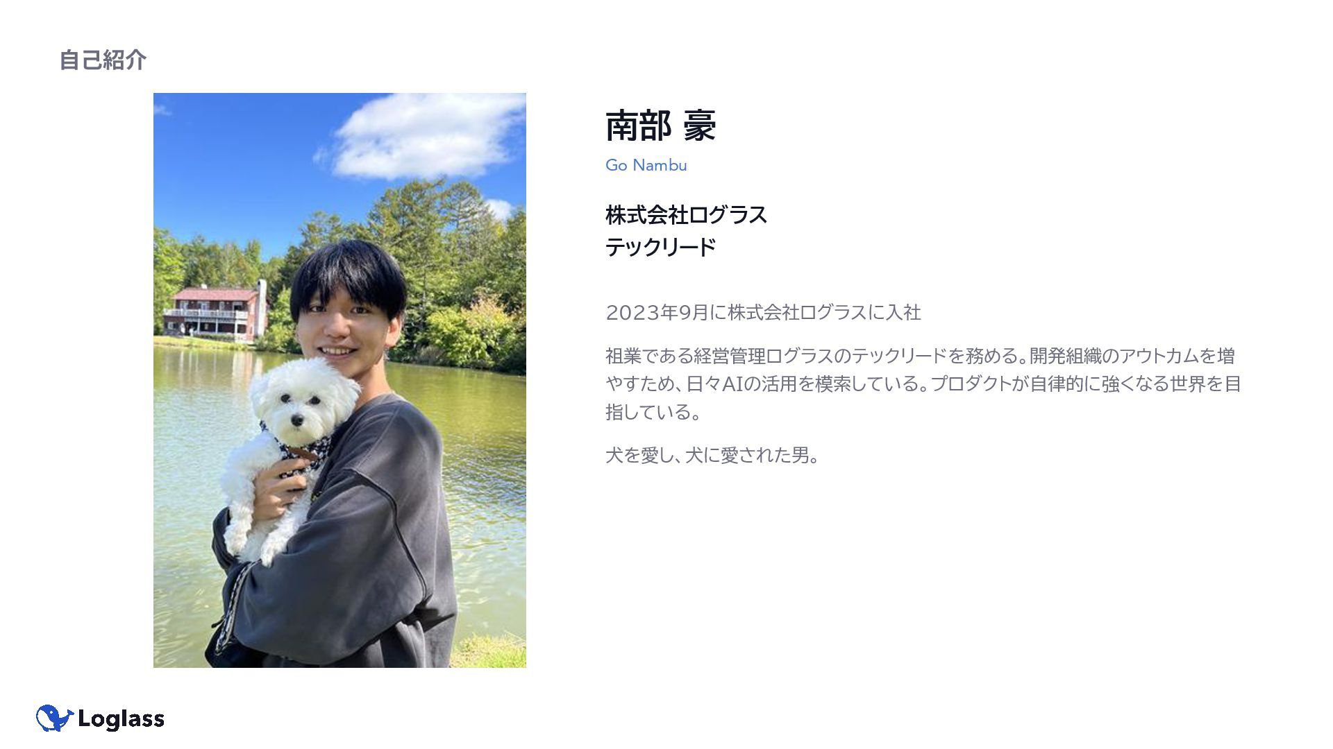 ⾃⼰紹介 2023年9月に株式会社ログラスに入社 祖業である経営管理ログラスのテックリードを務める。開発組織のアウトカムを増 やすため、日々AIの活用を模索している。プロダクトが自律的に強くなる世界を目 指している。 犬を愛し、犬に愛された男。 株式会社ログラス テックリード 南部 豪