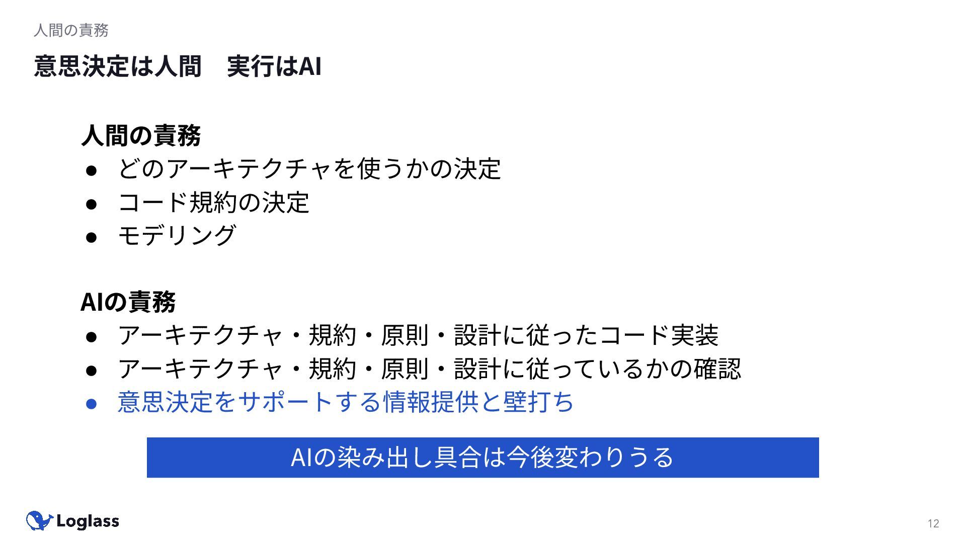 AIの責務 • アーキテクチャ‧規約‧原則‧設計に従ったコード実装 • アーキテクチャ‧規約‧原則‧設計に従っているかの確認 • 意思決定をサポートする情報提供と壁打ち AIの染み出し具合は今後変わりうる