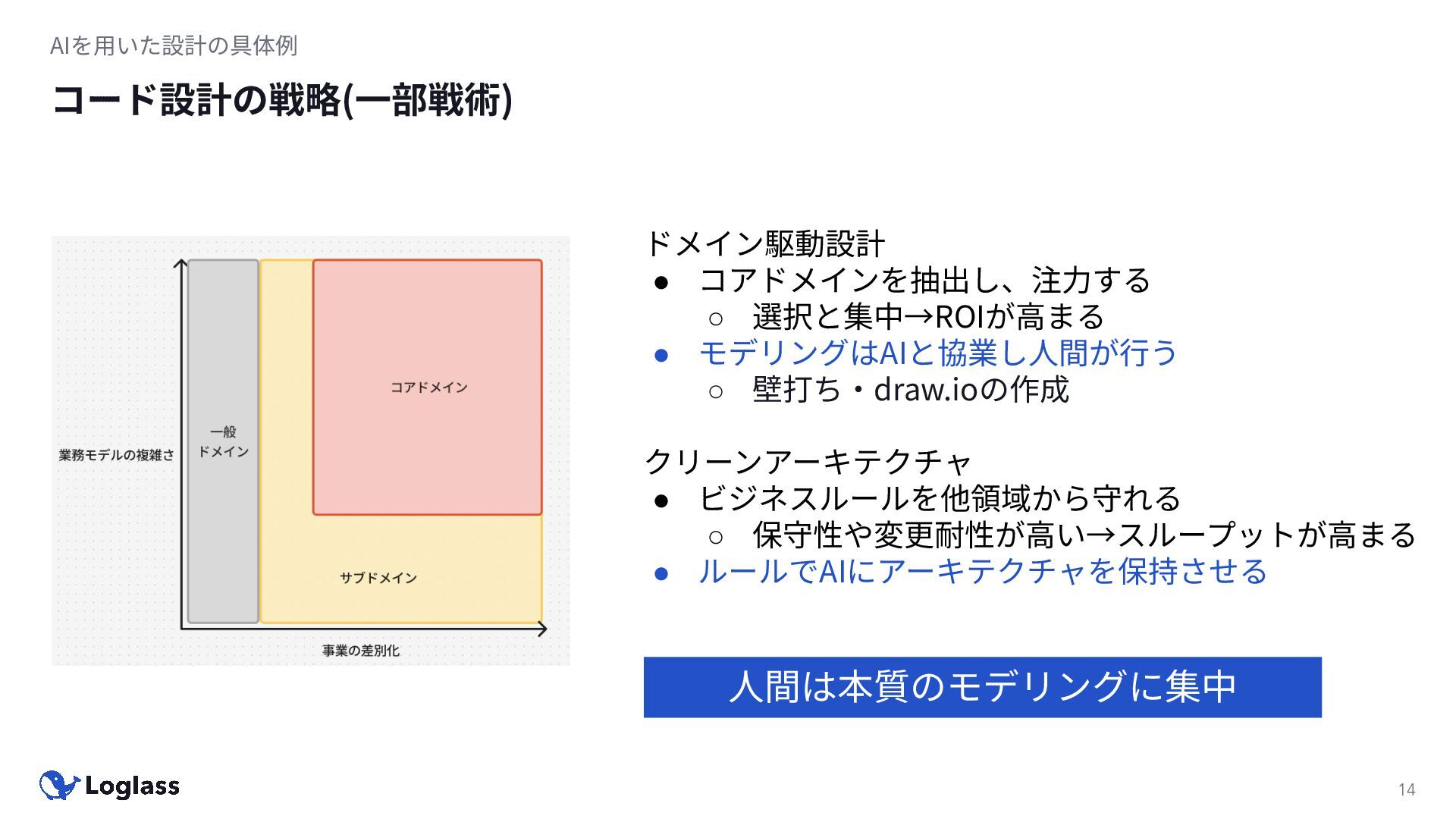 AIを⽤いた設計の具体例 14 コード設計の戦略(⼀部戦術) ドメイン駆動設計 • コアドメインを抽出し、注⼒する ◦ 選択と集中→ROIが⾼まる • モデリングはAIと協業し⼈間が⾏う
