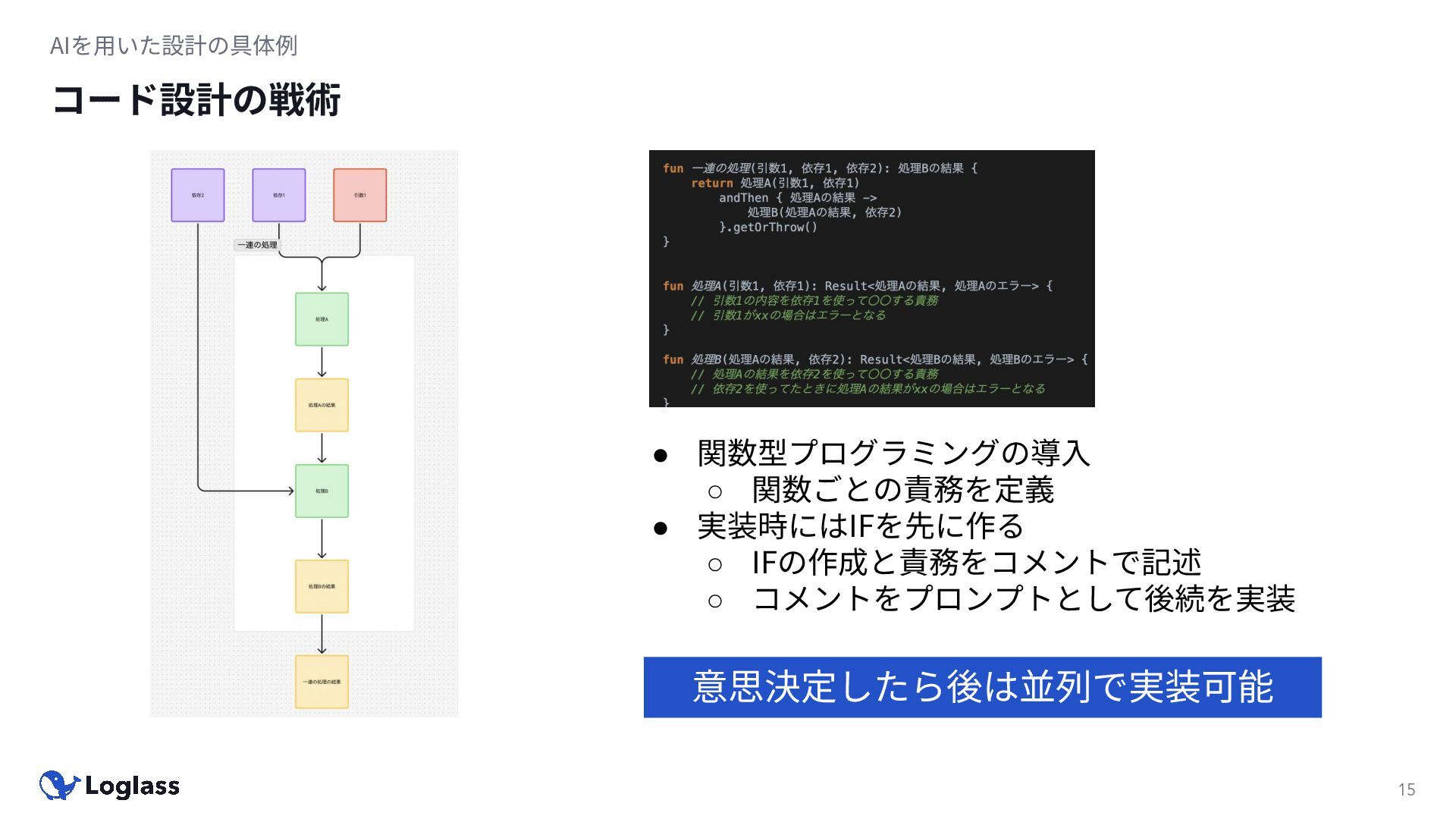 IFの作成と責務をコメントで記述 ◦ コメントをプロンプトとして後続を実装 意思決定したら後は並列で実装可能