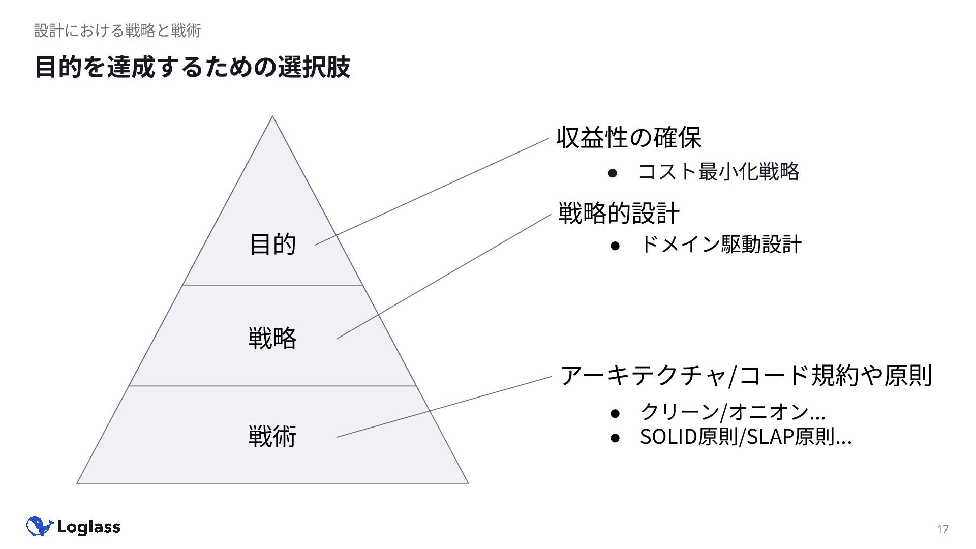 設計における戦略と戦術 17 ⽬的を達成するための選択肢 戦略 戦術 ⽬的 収益性の確保 戦略的設計 アーキテクチャ/コード規約や原則 •