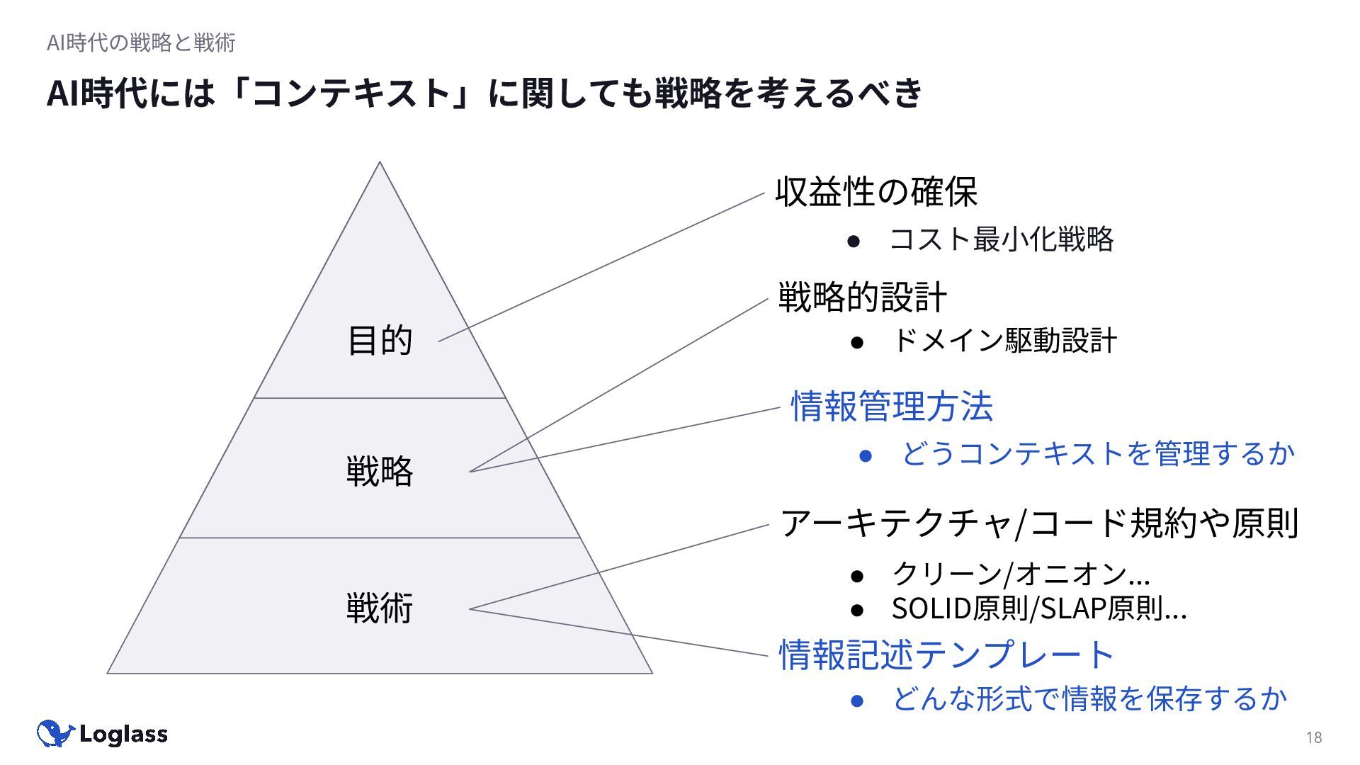 AI時代の戦略と戦術 18 AI時代には「コンテキスト」に関しても戦略を考えるべき 戦略 戦術 ⽬的 収益性の確保 戦略的設計 アーキテクチャ/コード規約や原則 •