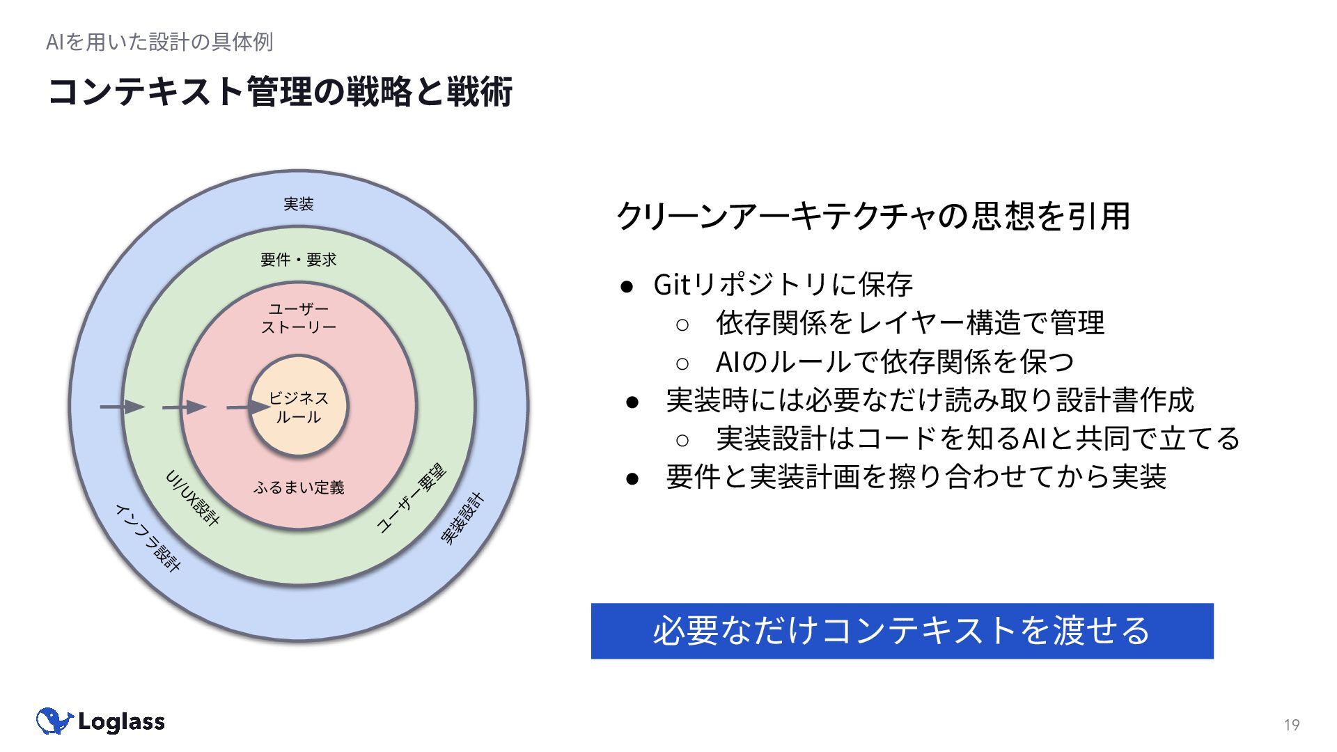 ン フ ラ 設 計 実 装 設 計 UI/UX設 計 ユ ー ザ ー 要 望 ふるまい定義 • Gitリポジトリに保存 ◦ 依存関係をレイヤー構造で管理 ◦ AIのルールで依存関係を保つ • 実装時には必要なだけ読み取り設計書作成 ◦ 実装設計はコードを知るAIと共同で⽴てる • 要件と実装計画を擦り合わせてから実装 必要なだけコンテキストを渡せる クリーンアーキテクチャの思想を引用