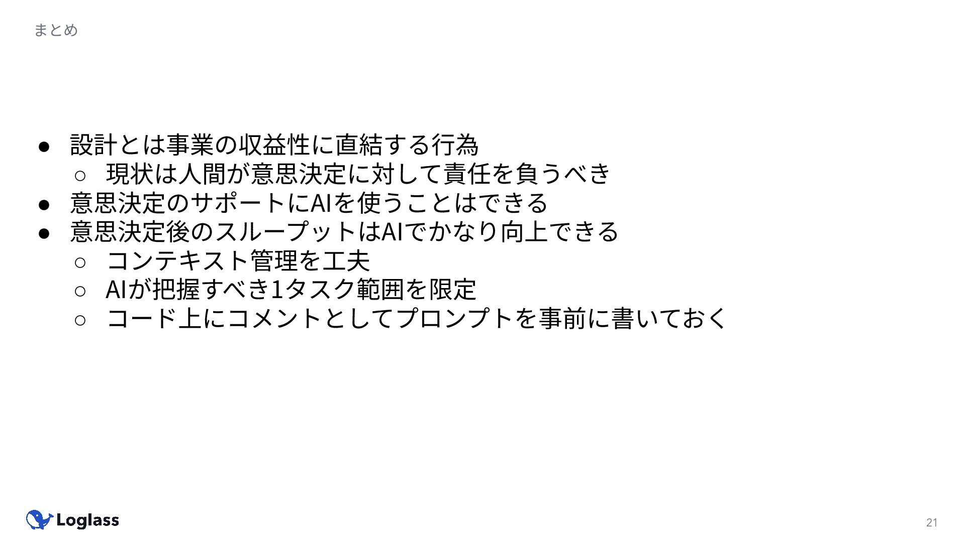 まとめ 21 • 設計とは事業の収益性に直結する⾏為 ◦ 現状は⼈間が意思決定に対して責任を負うべき • 意思決定のサポートにAIを使うことはできる • 意思決定後のスループットはAIでかなり向上できる