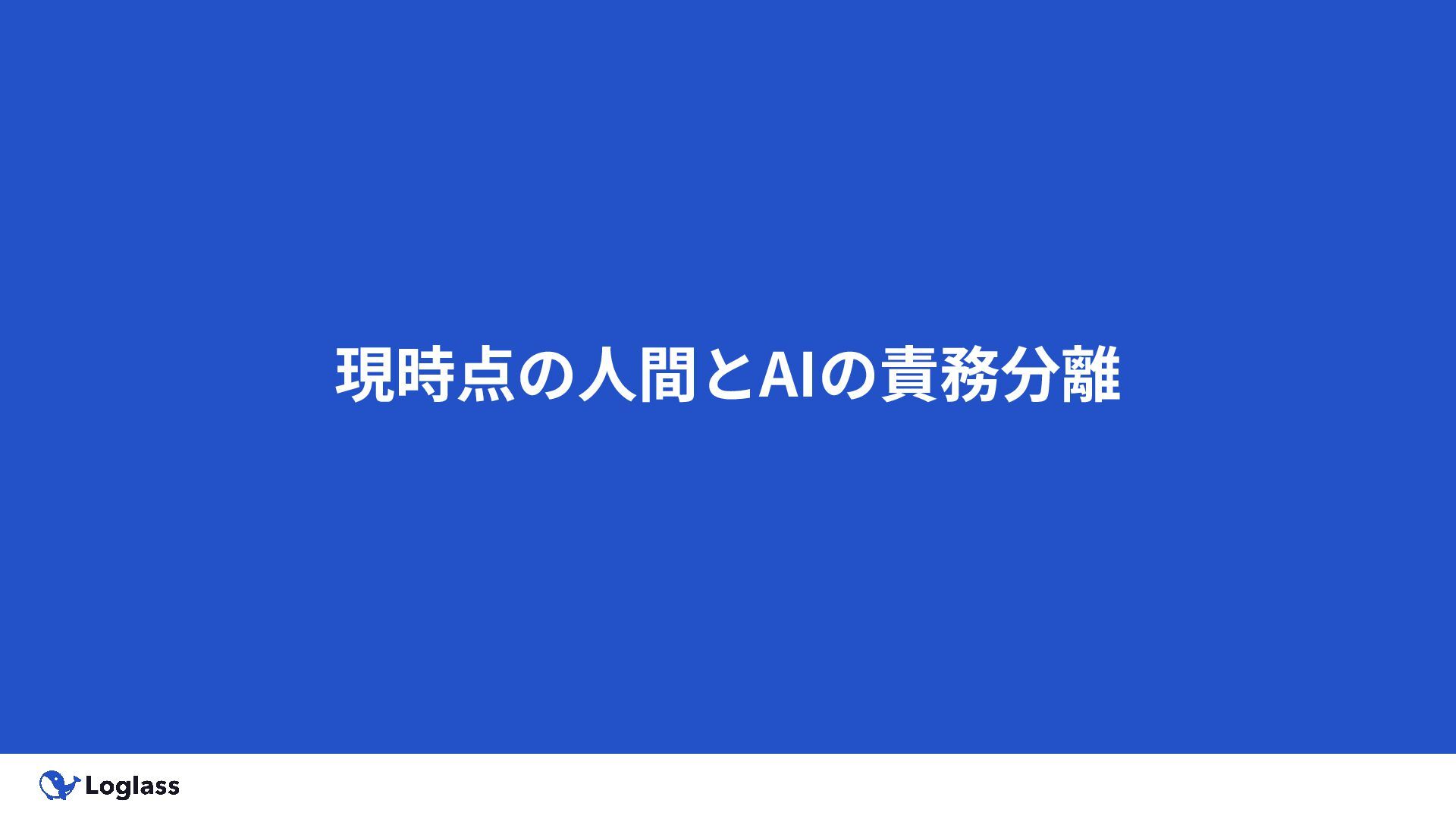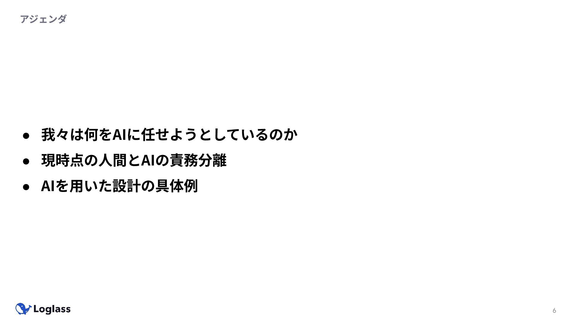 アジェンダ 6 • 我々は何をAIに任せようとしているのか • 現時点の⼈間とAIの責務分離 • AIを⽤いた設計の具体例
