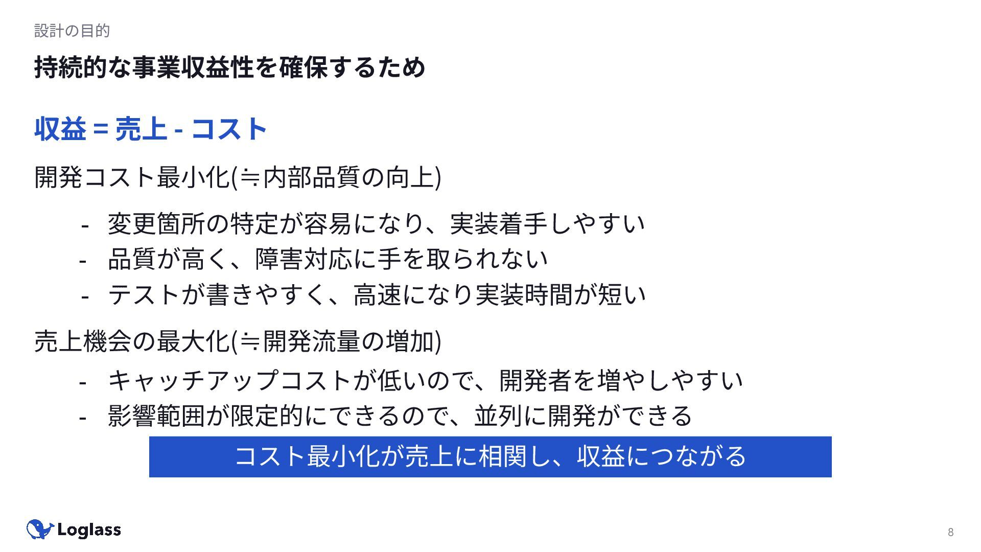 ‐ 品質が⾼く、障害対応に⼿を取られない - テストが書きやすく、⾼速になり実装時間が短い 売上機会の最⼤化(≒開発流量の増加) ‐ キャッチアップコストが低いので、開発者を増やしやすい ‐ 影響範囲が限定的にできるので、並列に開発ができる 持続的な事業収益性を確保するため コスト最⼩化が売上に相関し、収益につながる