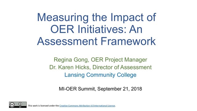 Gong, OER Project Manager Dr. Karen Hicks, Director of Assessment Lansing Community College MI-OER Summit, September 21, 2018 This work is licensed under the Creative Commons Attribution 4.0 International License.