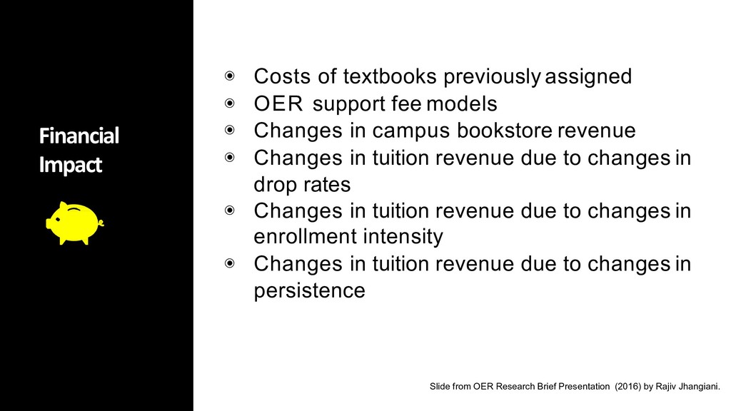 models ◉ Changes in campus bookstore revenue ◉ Changes in tuition revenue due to changes in drop rates ◉ Changes in tuition revenue due to changes in enrollment intensity ◉ Changes in tuition revenue due to changes in persistence Financial Impact Slide from OER Research Brief Presentation (2016) by Rajiv Jhangiani.