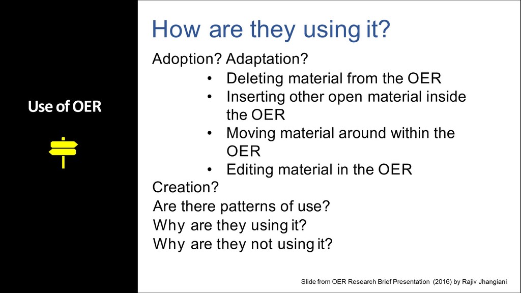 from the OER • Inserting other open material inside the OER • Moving material around within the OER • Editing material in the OER Creation? Are there patterns of use? Why are they using it? Why are they not using it? Use ofOER