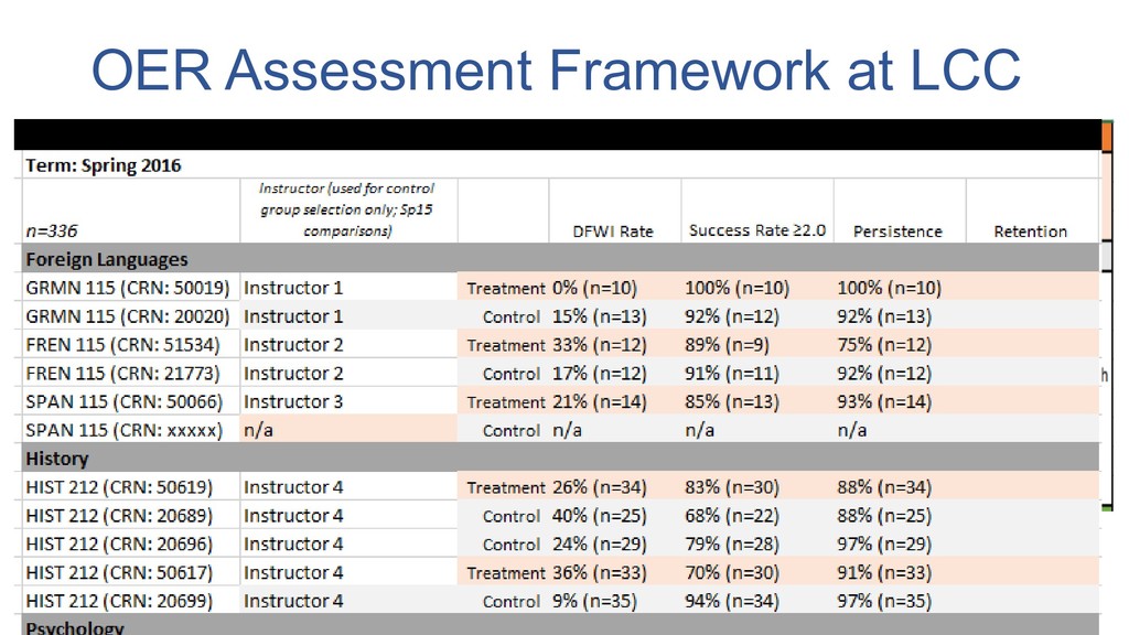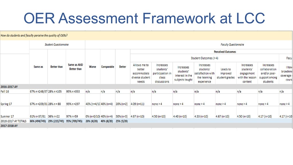 our OER project at LCC. • Importance of assessment. • Development of our assessment framework. • Elements and design of each assessment framework. • Snapshot of our data. • Questions and discussions.