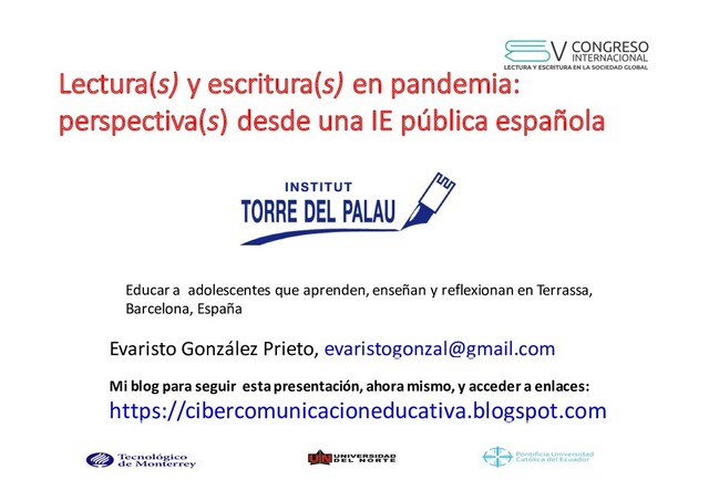 española Evaristo González Prieto, [email protected] Educar a adolescentes que aprenden, enseñan y reflexionan en Terrassa, Barcelona, España Mi blog para seguir esta presentación, ahora mismo, y acceder a enlaces: https://cibercomunicacioneducativa.blogspot.com