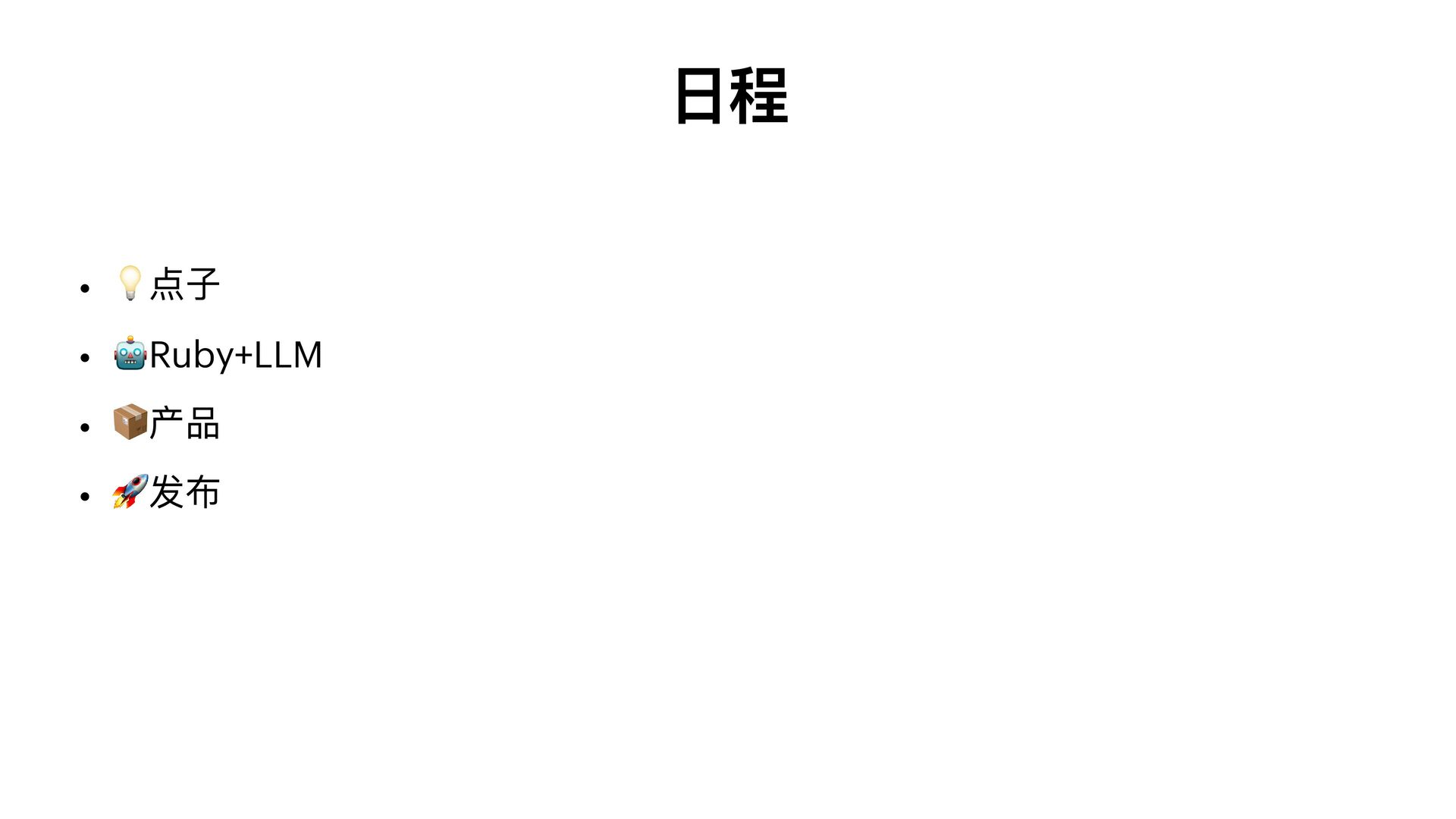 日 程 • 💡点 子 • 🤖Ruby+LLM • 📦产品 •