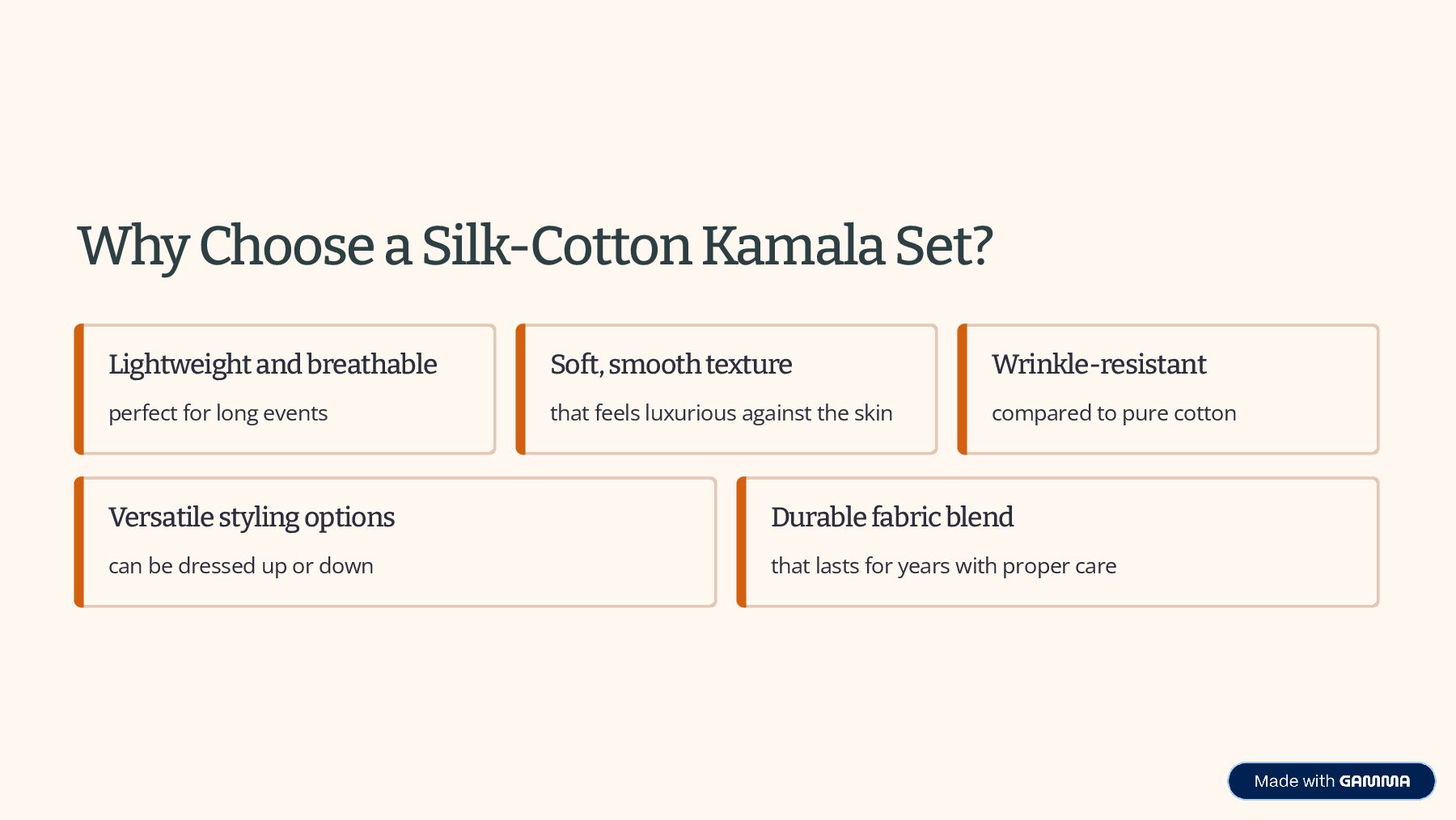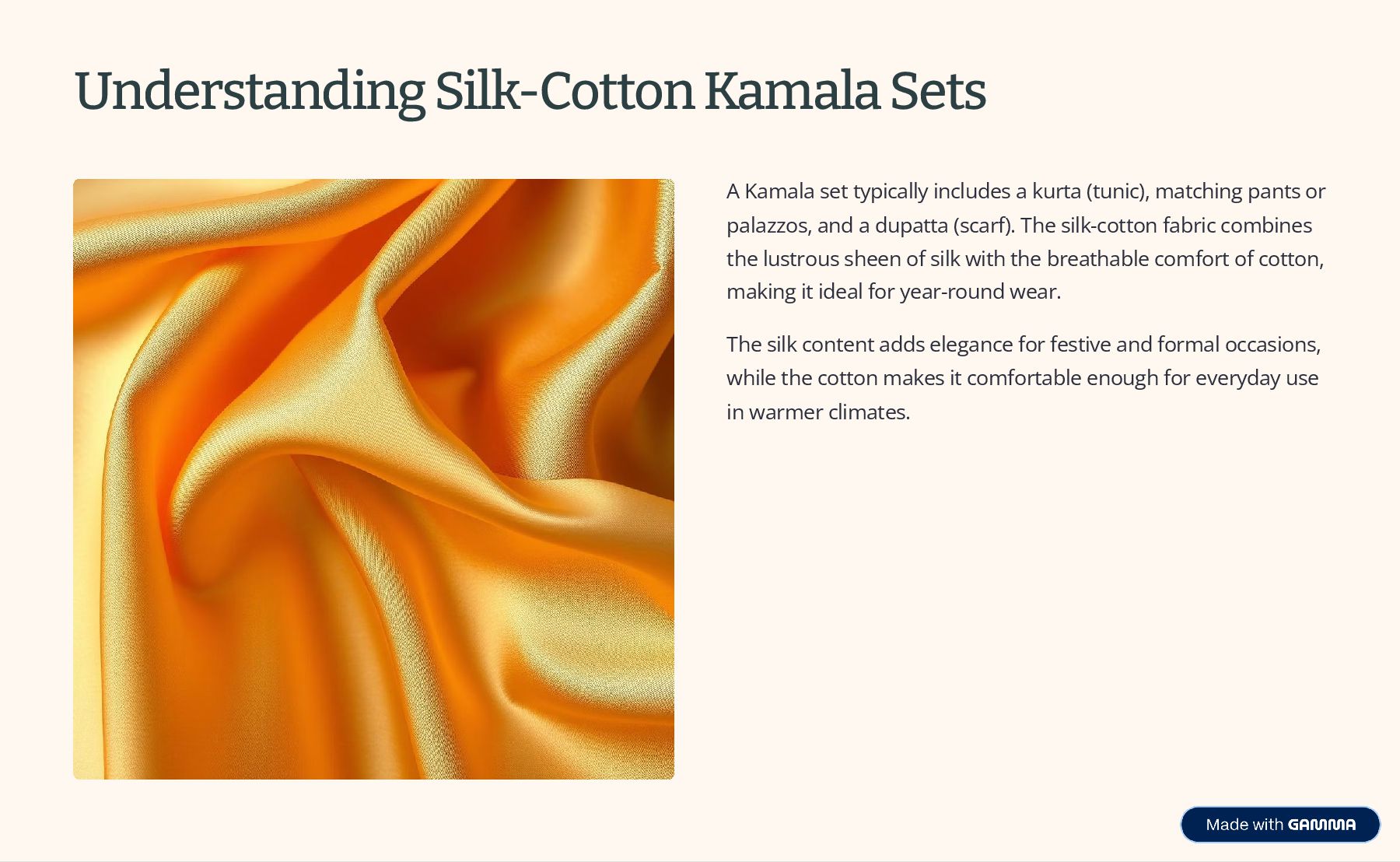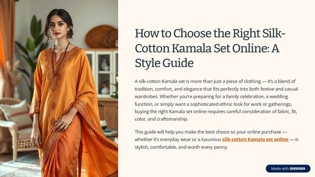 A Style Guide A silk-cotton Kamala set is more than just a piece of clothing 4 it9s a blend of tradition, comfort, and elegance that fits perfectly into both festive and casual wardrobes. Whether you9re preparing for a family celebration, a wedding function, or simply want a sophisticated ethnic look for work or gatherings, buying the right Kamala set online requires careful consideration of fabric, fit, color, and craftsmanship. This guide will help you make the best choice so your online purchase 4 whether it9s everyday wear or a luxurious silk-cotton Kamala set online 4 is stylish, comfortable, and worth every penny.