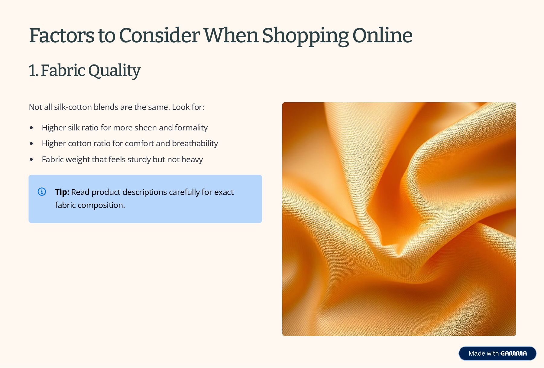 all silk-cotton blends are the same. Look for: Higher silk ratio for more sheen and formality Higher cotton ratio for comfort and breathability Fabric weight that feels sturdy but not heavy Tip: Read product descriptions carefully for exact fabric composition.