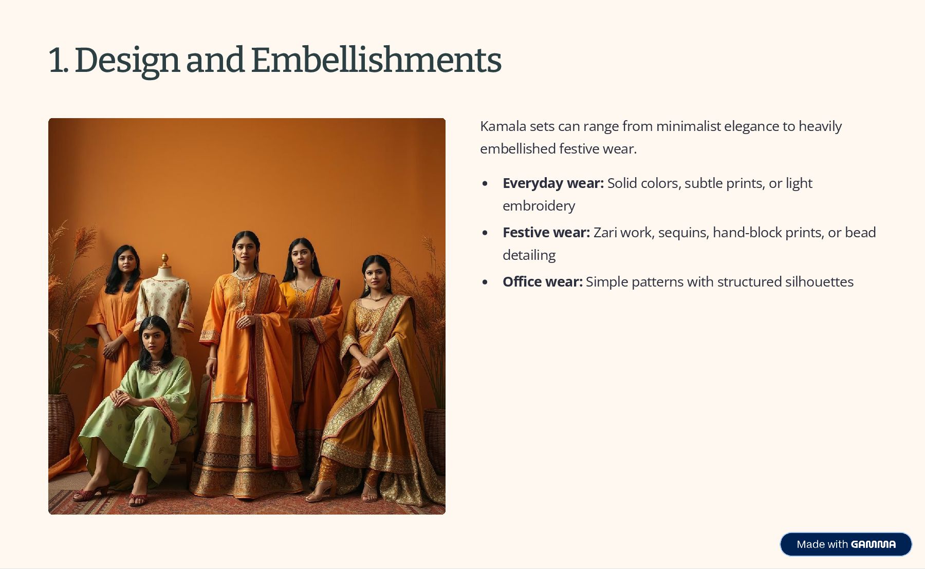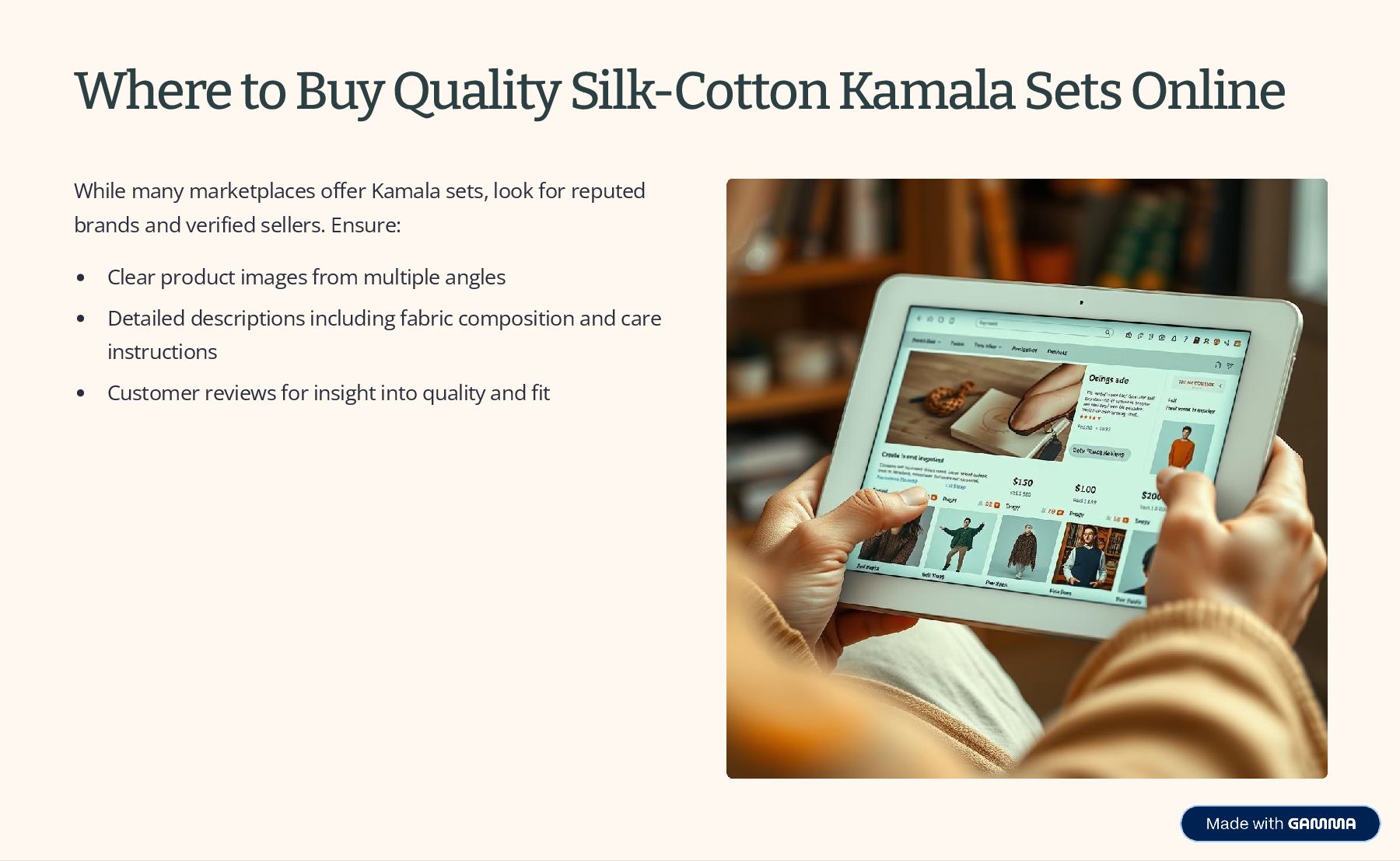 marketplaces offer Kamala sets, look for reputed brands and verified sellers. Ensure: Clear product images from multiple angles Detailed descriptions including fabric composition and care instructions Customer reviews for insight into quality and fit