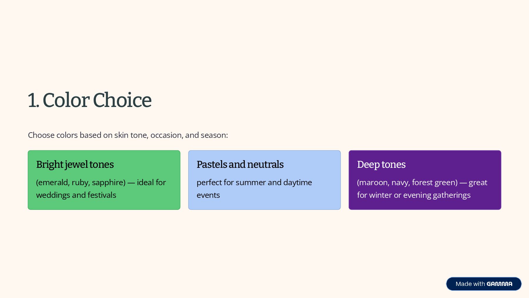 and season: Bright jewel tones (emerald, ruby, sapphire) 4 ideal for weddings and festivals Pastels and neutrals perfect for summer and daytime events Deep tones (maroon, navy, forest green) 4 great for winter or evening gatherings