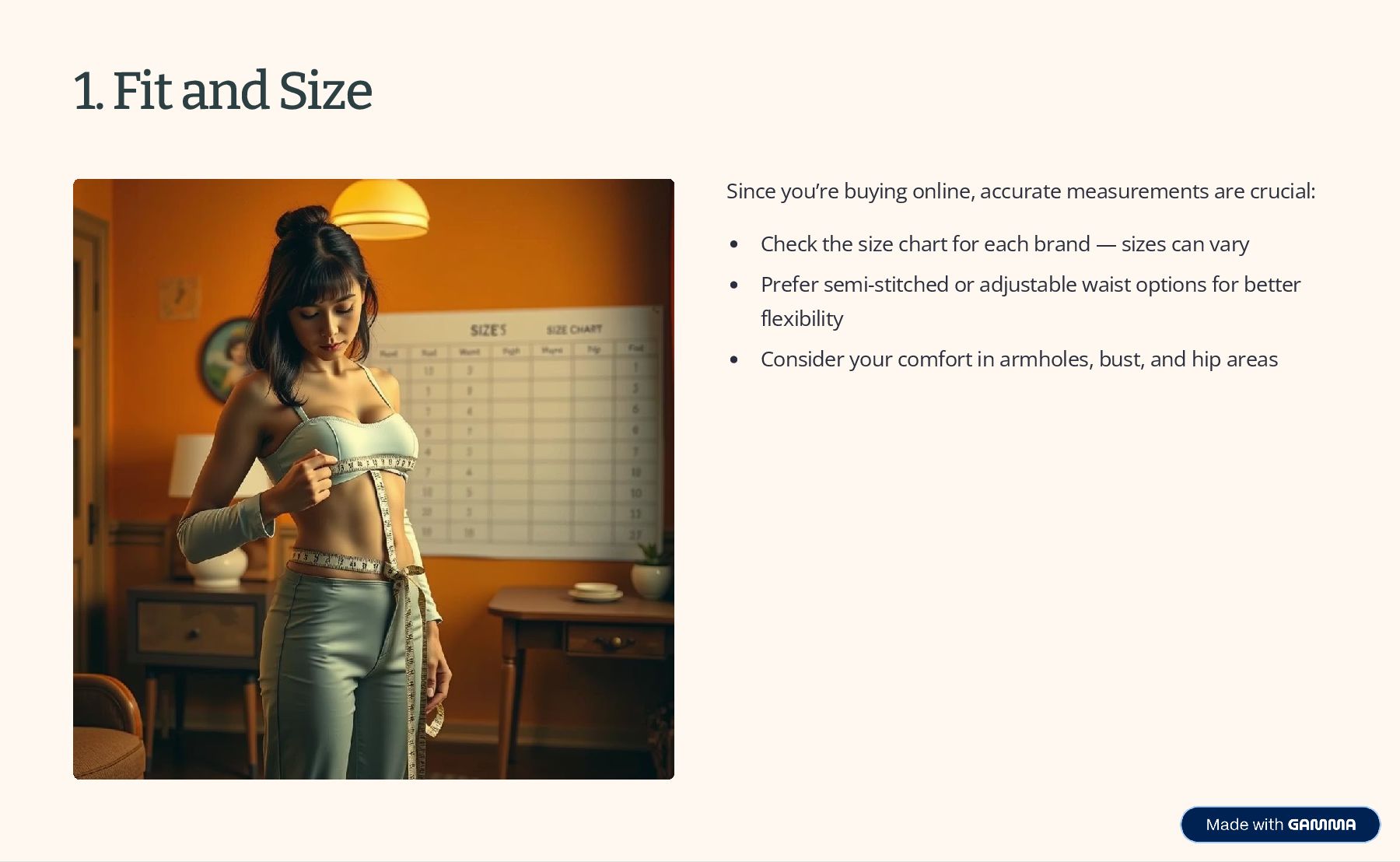 are crucial: Check the size chart for each brand 4 sizes can vary Prefer semi-stitched or adjustable waist options for better flexibility Consider your comfort in armholes, bust, and hip areas