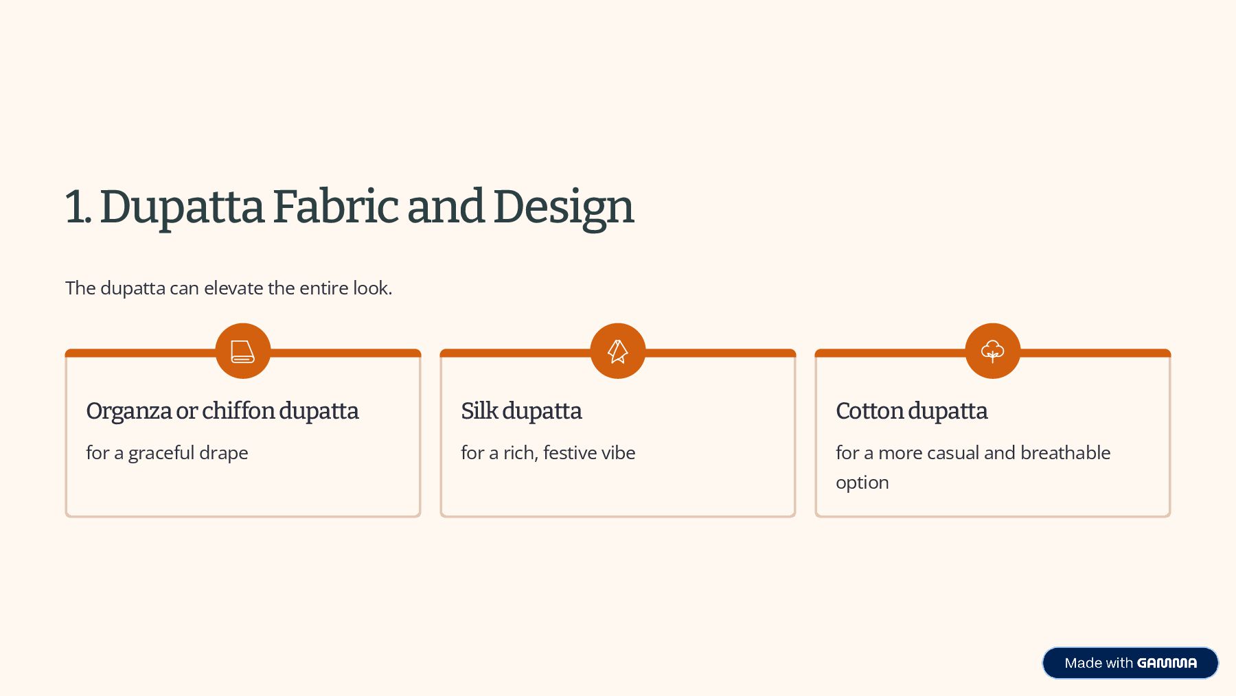 entire look. Organza or chiffon dupatta for a graceful drape Silk dupatta for a rich, festive vibe Cotton dupatta for a more casual and breathable option
