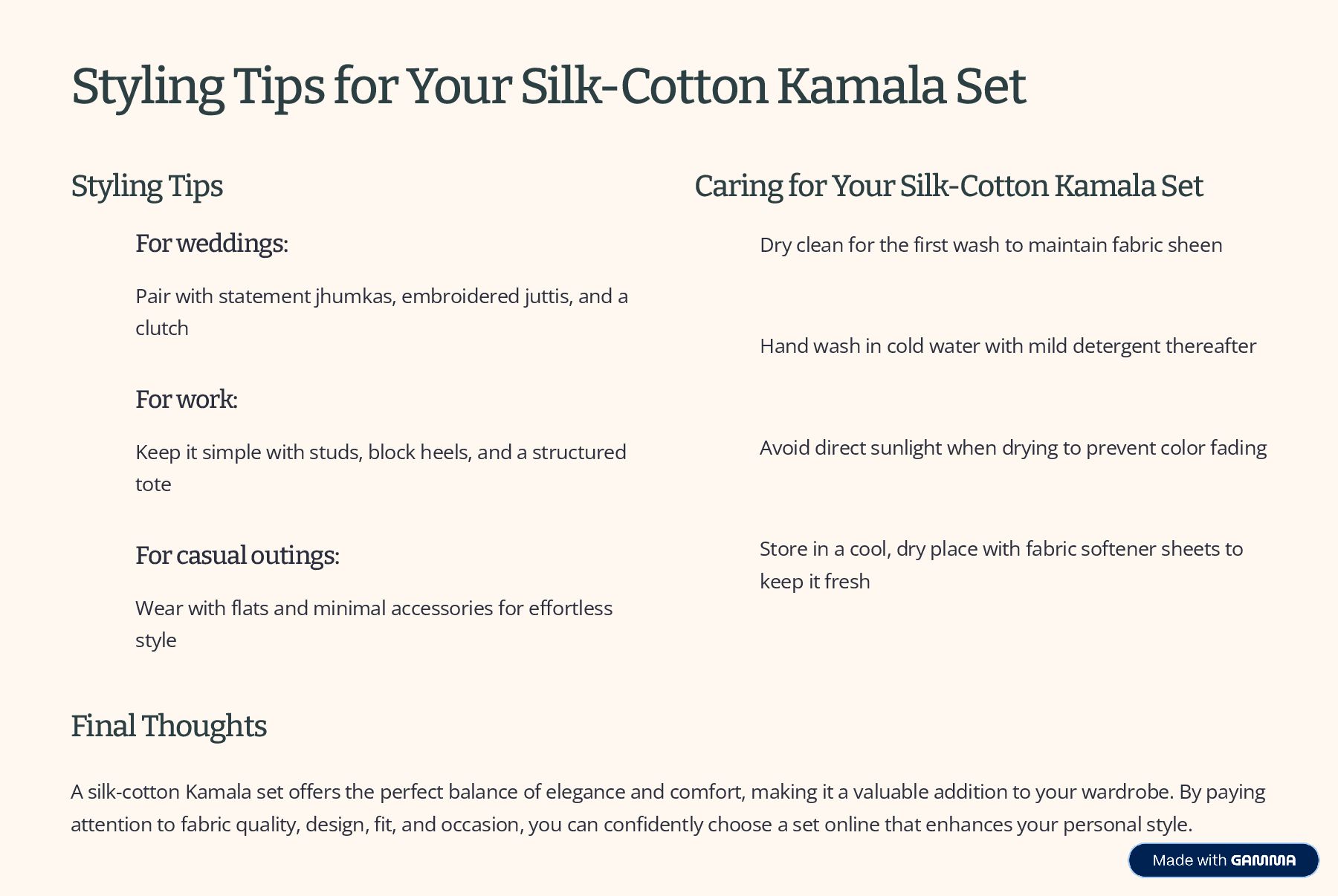 weddings: Pair with statement jhumkas, embroidered juttis, and a clutch For work: Keep it simple with studs, block heels, and a structured tote For casual outings: Wear with flats and minimal accessories for effortless style Caring for Your Silk-Cotton Kamala Set Dry clean for the first wash to maintain fabric sheen Hand wash in cold water with mild detergent thereafter Avoid direct sunlight when drying to prevent color fading Store in a cool, dry place with fabric softener sheets to keep it fresh Final Thoughts A silk-cotton Kamala set offers the perfect balance of elegance and comfort, making it a valuable addition to your wardrobe. By paying attention to fabric quality, design, fit, and occasion, you can confidently choose a set online that enhances your personal style.