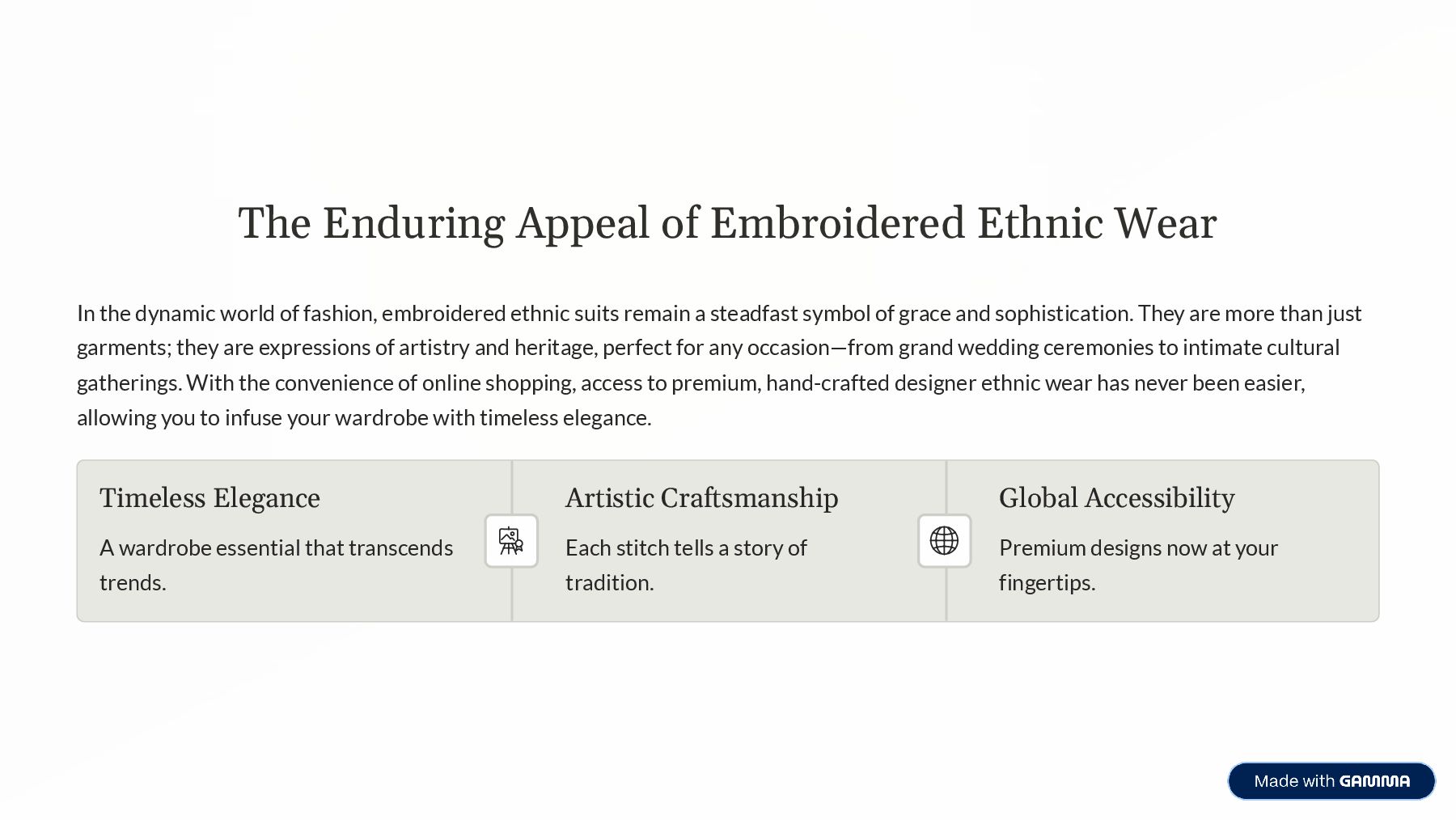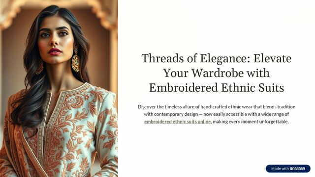 world of fashion, embroidered ethnic suits remain a steadfast symbol of grace and sophistication. They are more than just garments; they are expressions of artistry and heritage, perfect for any occasion4from grand wedding ceremonies to intimate cultural gatherings. With the convenience of online shopping, access to premium, hand-crafted designer ethnic wear has never been easier, allowing you to infuse your wardrobe with timeless elegance. Timeless Elegance A wardrobe essential that transcends trends. Artistic Craftsmanship Each stitch tells a story of tradition. Global Accessibility Premium designs now at your fingertips.