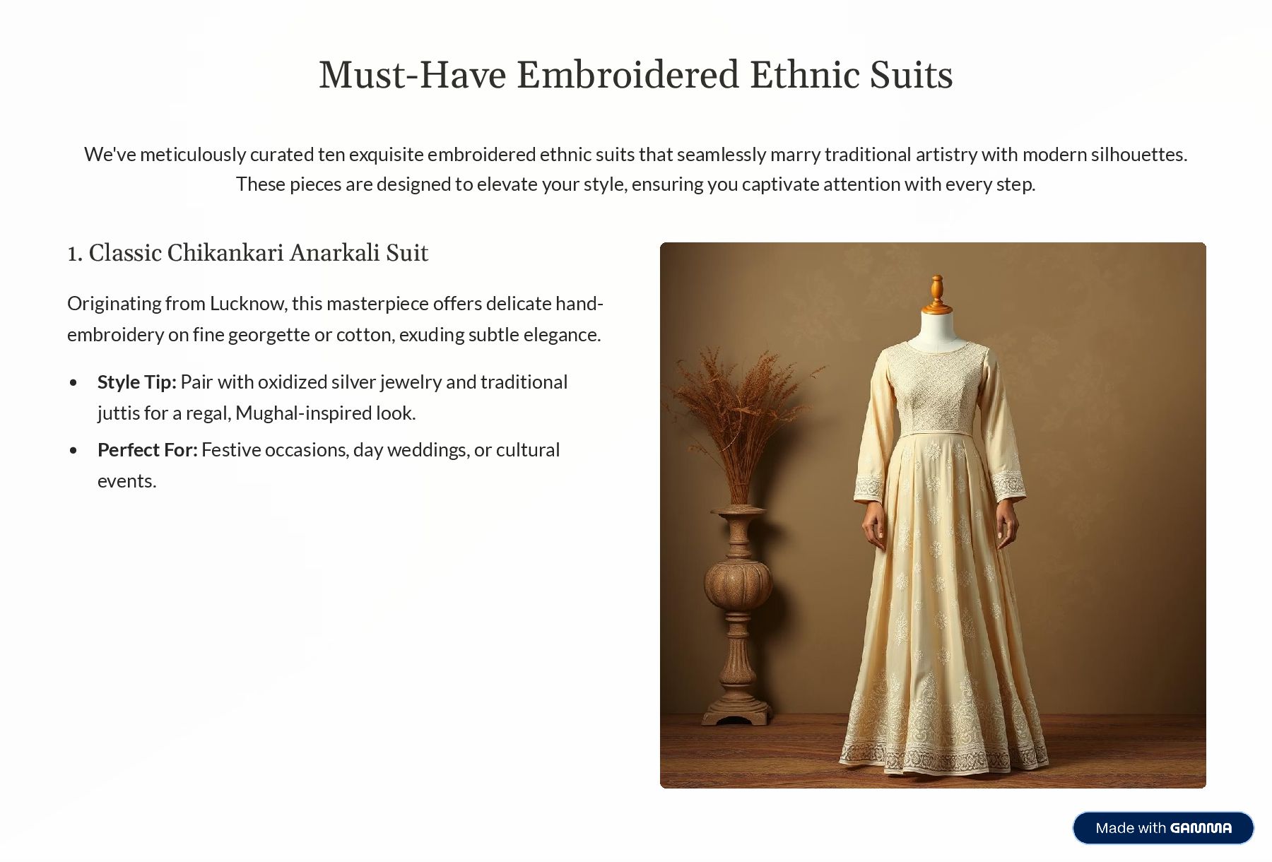 ethnic suits that seamlessly marry traditional artistry with modern silhouettes. These pieces are designed to elevate your style, ensuring you captivate attention with every step. 1. Classic Chikankari Anarkali Suit Originating from Lucknow, this masterpiece offers delicate hand- embroidery on fine georgette or cotton, exuding subtle elegance. Style Tip: Pair with oxidized silver jewelry and traditional juttis for a regal, Mughal-inspired look. Perfect For: Festive occasions, day weddings, or cultural events.