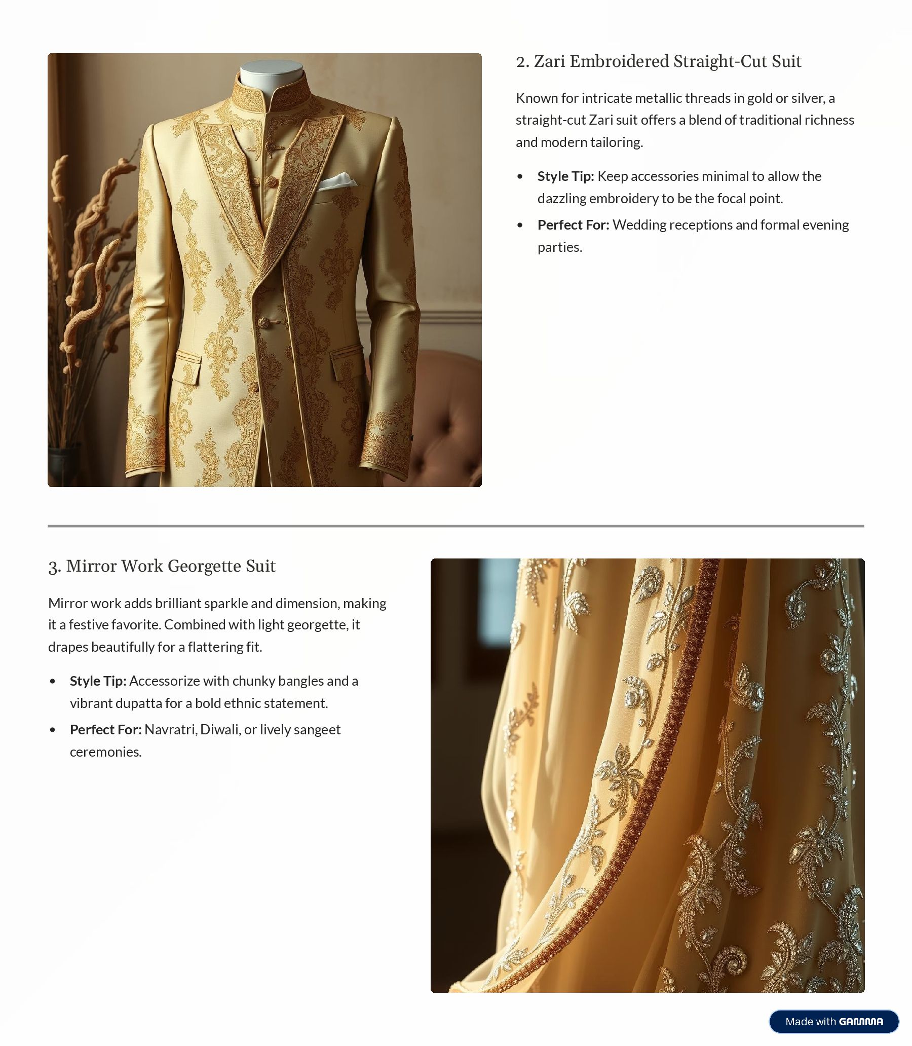 in gold or silver, a straight-cut Zari suit offers a blend of traditional richness and modern tailoring. Style Tip: Keep accessories minimal to allow the dazzling embroidery to be the focal point. Perfect For: Wedding receptions and formal evening parties. 3. Mirror Work Georgette Suit Mirror work adds brilliant sparkle and dimension, making it a festive favorite. Combined with light georgette, it drapes beautifully for a flattering fit. Style Tip: Accessorize with chunky bangles and a vibrant dupatta for a bold ethnic statement. Perfect For: Navratri, Diwali, or lively sangeet ceremonies.