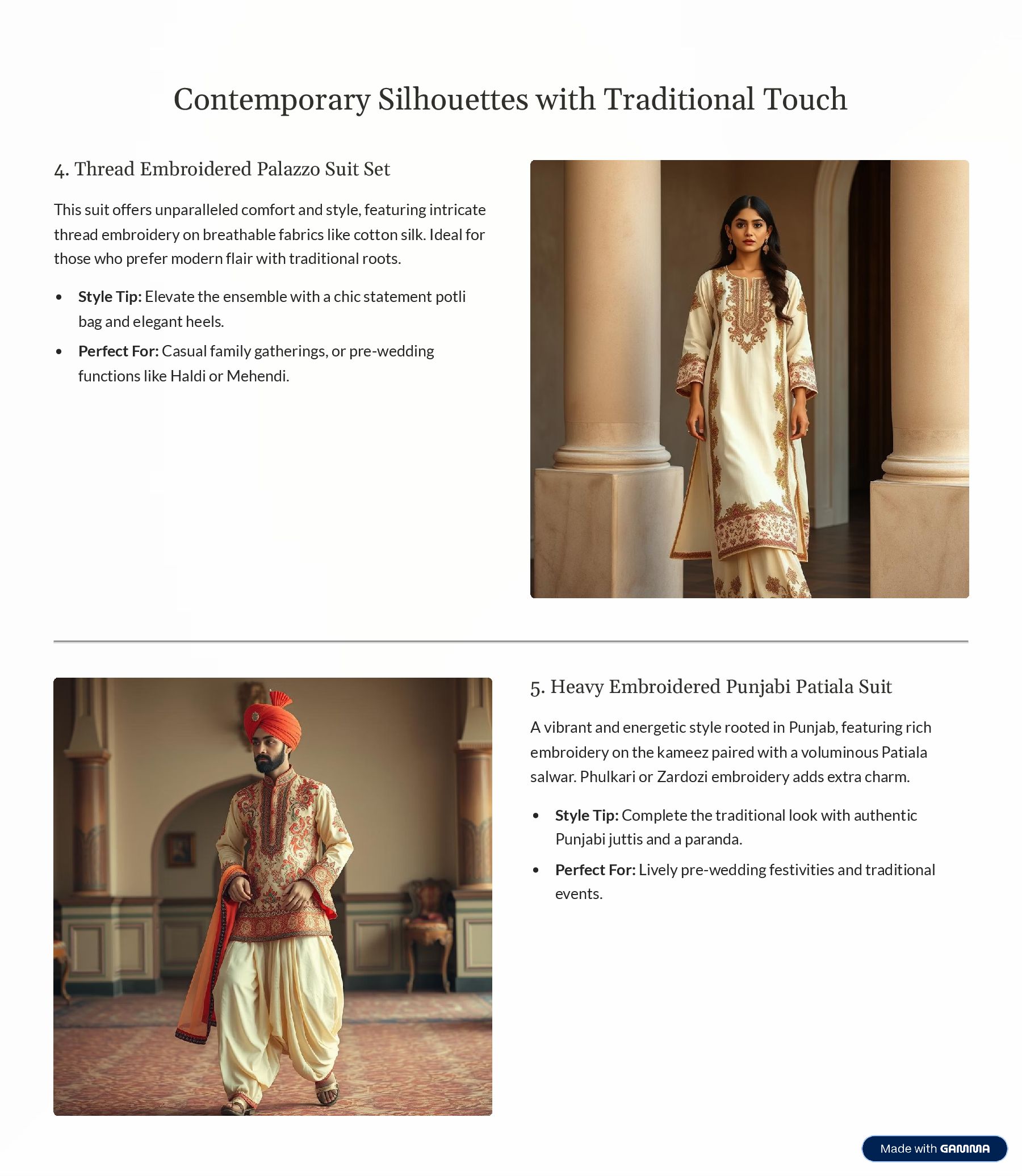 Set This suit offers unparalleled comfort and style, featuring intricate thread embroidery on breathable fabrics like cotton silk. Ideal for those who prefer modern flair with traditional roots. Style Tip: Elevate the ensemble with a chic statement potli bag and elegant heels. Perfect For: Casual family gatherings, or pre-wedding functions like Haldi or Mehendi. 5. Heavy Embroidered Punjabi Patiala Suit A vibrant and energetic style rooted in Punjab, featuring rich embroidery on the kameez paired with a voluminous Patiala salwar. Phulkari or Zardozi embroidery adds extra charm. Style Tip: Complete the traditional look with authentic Punjabi juttis and a paranda. Perfect For: Lively pre-wedding festivities and traditional events.