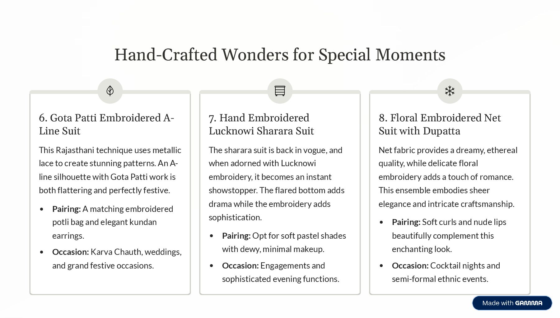 Line Suit This Rajasthani technique uses metallic lace to create stunning patterns. An A- line silhouette with Gota Patti work is both flattering and perfectly festive. Pairing: A matching embroidered potli bag and elegant kundan earrings. Occasion: Karva Chauth, weddings, and grand festive occasions. 7. Hand Embroidered Lucknowi Sharara Suit The sharara suit is back in vogue, and when adorned with Lucknowi embroidery, it becomes an instant showstopper. The flared bottom adds drama while the embroidery adds sophistication. Pairing: Opt for soft pastel shades with dewy, minimal makeup. Occasion: Engagements and sophisticated evening functions. 8. Floral Embroidered Net Suit with Dupatta Net fabric provides a dreamy, ethereal quality, while delicate floral embroidery adds a touch of romance. This ensemble embodies sheer elegance and intricate craftsmanship. Pairing: Soft curls and nude lips beautifully complement this enchanting look. Occasion: Cocktail nights and semi-formal ethnic events.