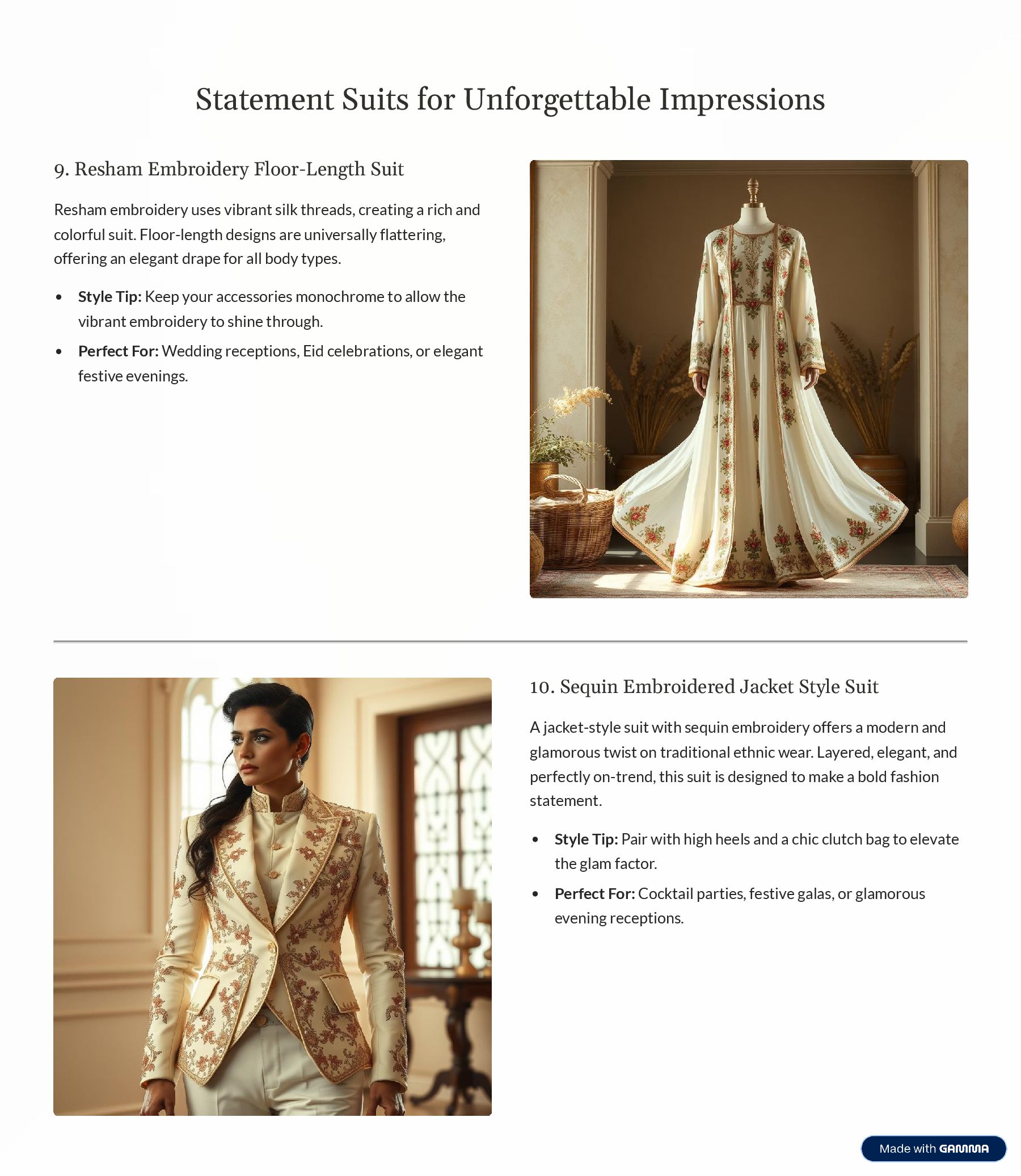 Resham embroidery uses vibrant silk threads, creating a rich and colorful suit. Floor-length designs are universally flattering, offering an elegant drape for all body types. Style Tip: Keep your accessories monochrome to allow the vibrant embroidery to shine through. Perfect For: Wedding receptions, Eid celebrations, or elegant festive evenings. 10. Sequin Embroidered Jacket Style Suit A jacket-style suit with sequin embroidery offers a modern and glamorous twist on traditional ethnic wear. Layered, elegant, and perfectly on-trend, this suit is designed to make a bold fashion statement. Style Tip: Pair with high heels and a chic clutch bag to elevate the glam factor. Perfect For: Cocktail parties, festive galas, or glamorous evening receptions.