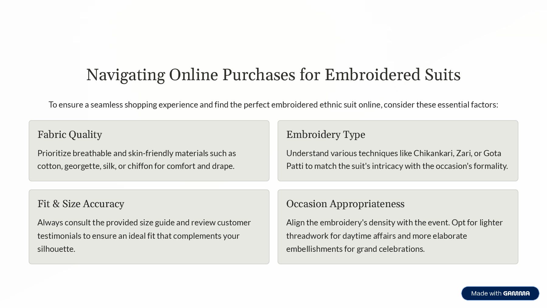 shopping experience and find the perfect embroidered ethnic suit online, consider these essential factors: Fabric Quality Prioritize breathable and skin-friendly materials such as cotton, georgette, silk, or chiffon for comfort and drape. Embroidery Type Understand various techniques like Chikankari, Zari, or Gota Patti to match the suit's intricacy with the occasion's formality. Fit & Size Accuracy Always consult the provided size guide and review customer testimonials to ensure an ideal fit that complements your silhouette. Occasion Appropriateness Align the embroidery's density with the event. Opt for lighter threadwork for daytime affairs and more elaborate embellishments for grand celebrations.