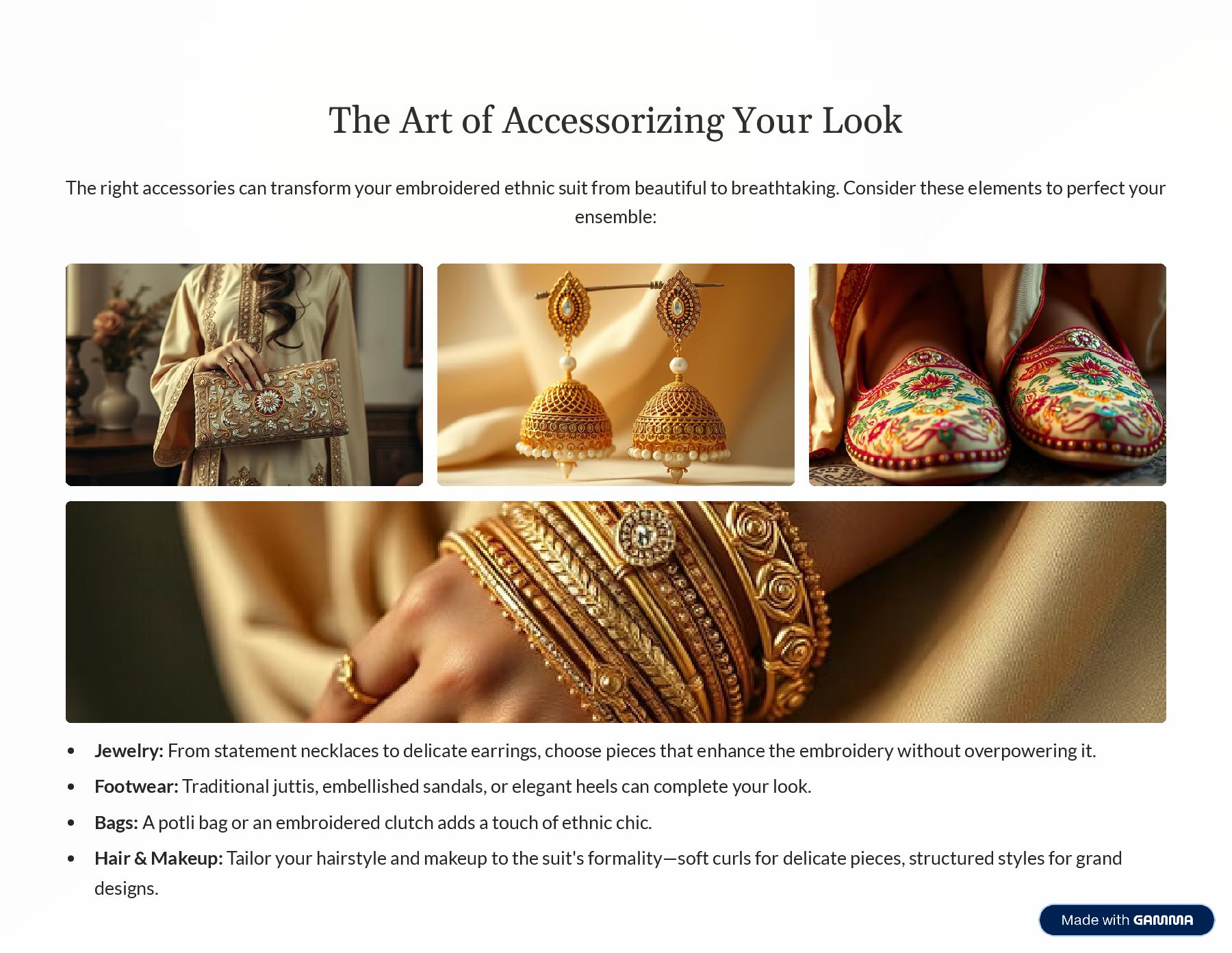 transform your embroidered ethnic suit from beautiful to breathtaking. Consider these elements to perfect your ensemble: Jewelry: From statement necklaces to delicate earrings, choose pieces that enhance the embroidery without overpowering it. Footwear: Traditional juttis, embellished sandals, or elegant heels can complete your look. Bags: A potli bag or an embroidered clutch adds a touch of ethnic chic. Hair & Makeup: Tailor your hairstyle and makeup to the suit's formality4soft curls for delicate pieces, structured styles for grand designs.