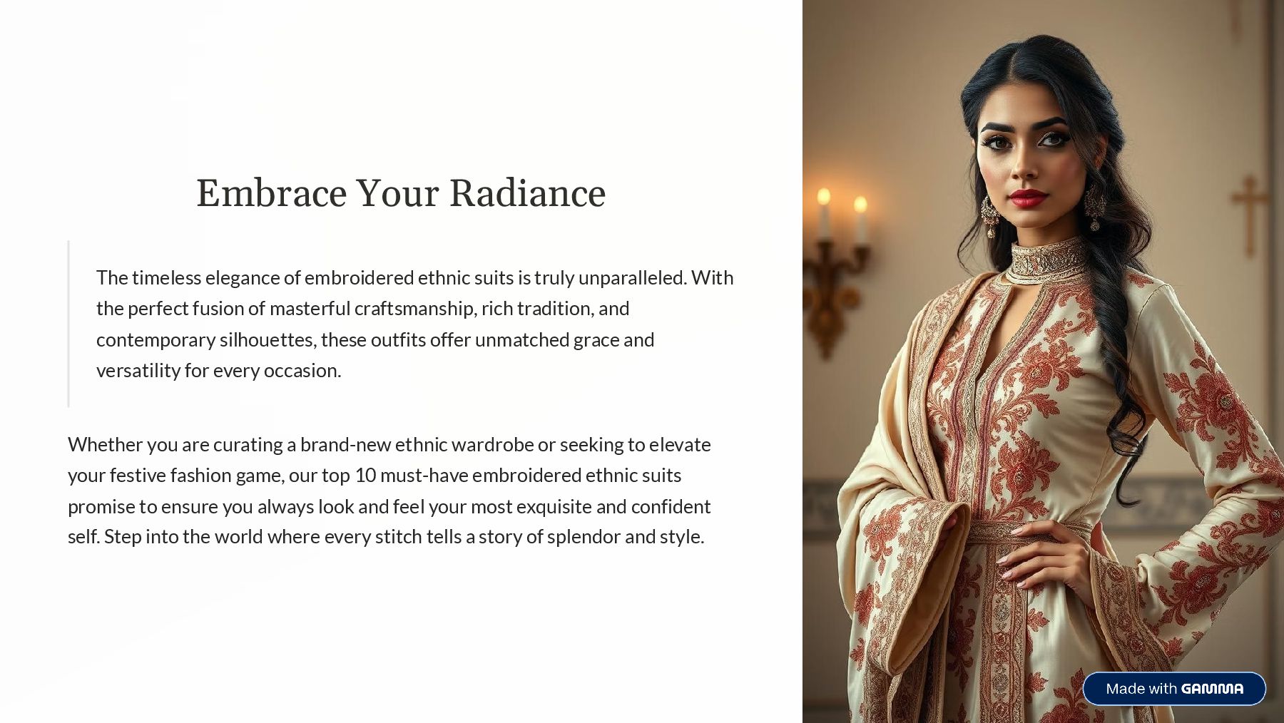 is truly unparalleled. With the perfect fusion of masterful craftsmanship, rich tradition, and contemporary silhouettes, these outfits offer unmatched grace and versatility for every occasion. Whether you are curating a brand-new ethnic wardrobe or seeking to elevate your festive fashion game, our top 10 must-have embroidered ethnic suits promise to ensure you always look and feel your most exquisite and confident self. Step into the world where every stitch tells a story of splendor and style.
