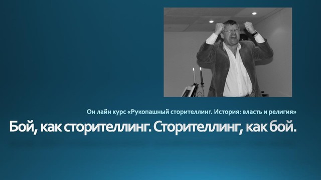 Сторителлинг, как и рукопашный бой это прежде всего преодоление. Не противника. Преодоление страха смерти. Воспитание (если хотите вспоминание) в себе особого состояния. Состояния преодоления страха смерти. И трансляция этого состояния на свою аудиторию. Лояльную или наоборот резко негативно настроенную.