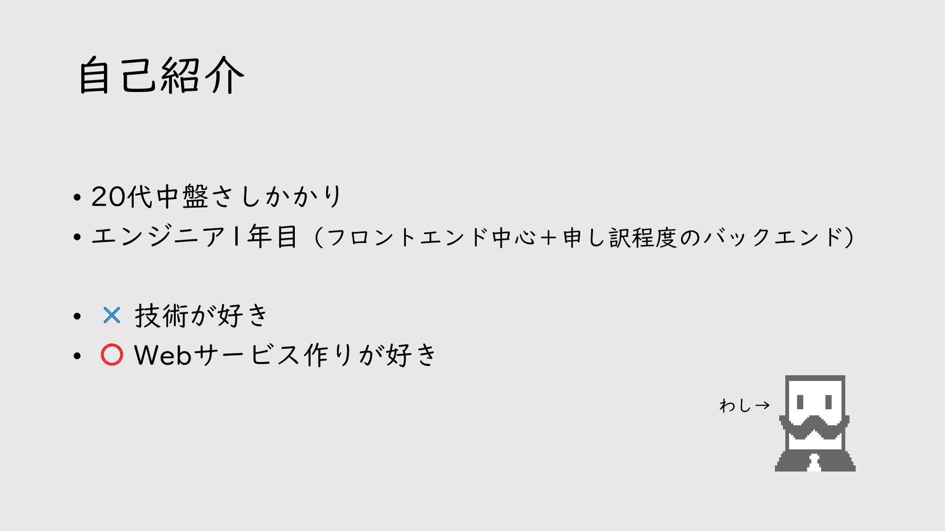 自己紹介 • 20代中盤さしかかり • エンジニア1年目(フロントエンド中心+申し訳程度のバックエンド) • × 技術が好き • 〇