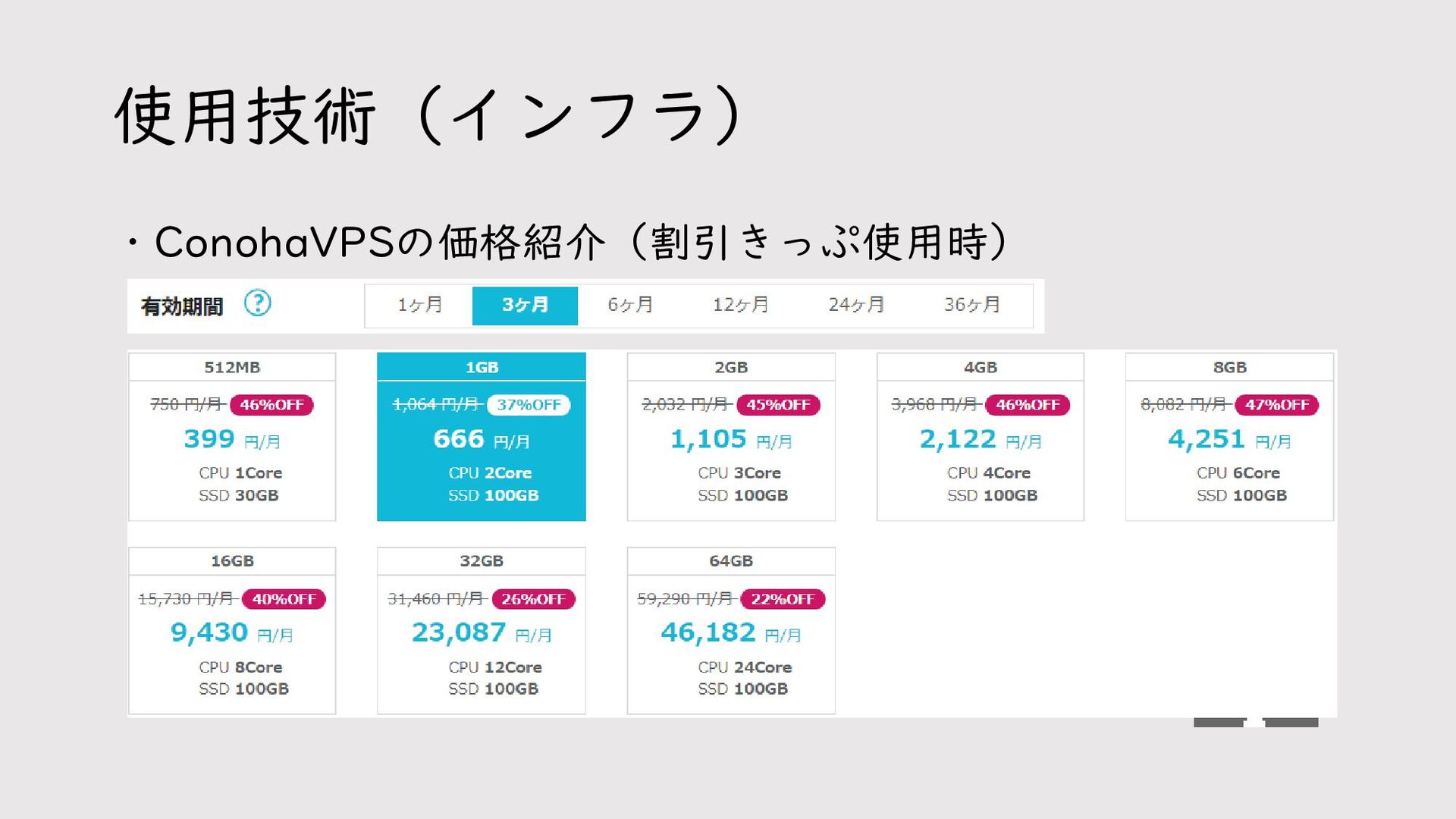 使用技術(インフラ) ・ConohaVPSの価格紹介(割引きっぷ使用時)