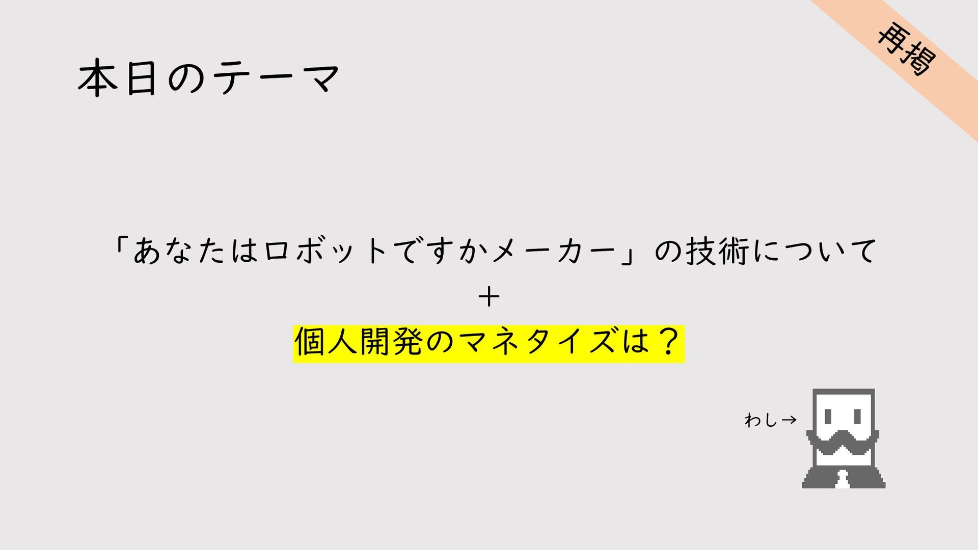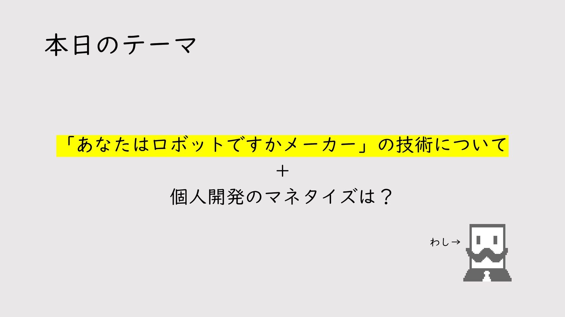 本日のテーマ 「あなたはロボットですかメーカー」の技術について + 個人開発のマネタイズは? わし→