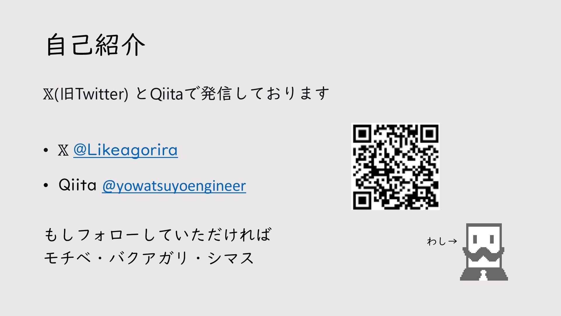 自己紹介 𝕏(旧Twitter) とQiitaで発信しております • 𝕏 @Likeagorira • Qiita @yowatsuyoengineer もしフォローしていただければ