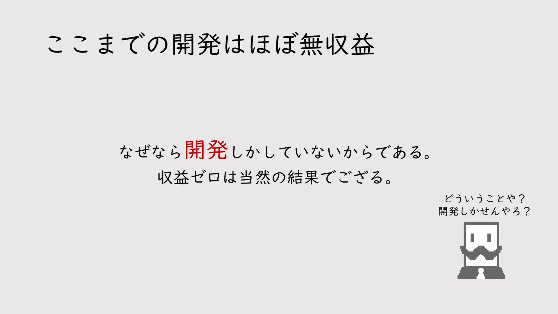 ここまでの開発はほぼ無収益 なぜなら開発しかしていないからである。 収益ゼロは当然の結果でござる。 どういうことや? 開発しかせんやろ?