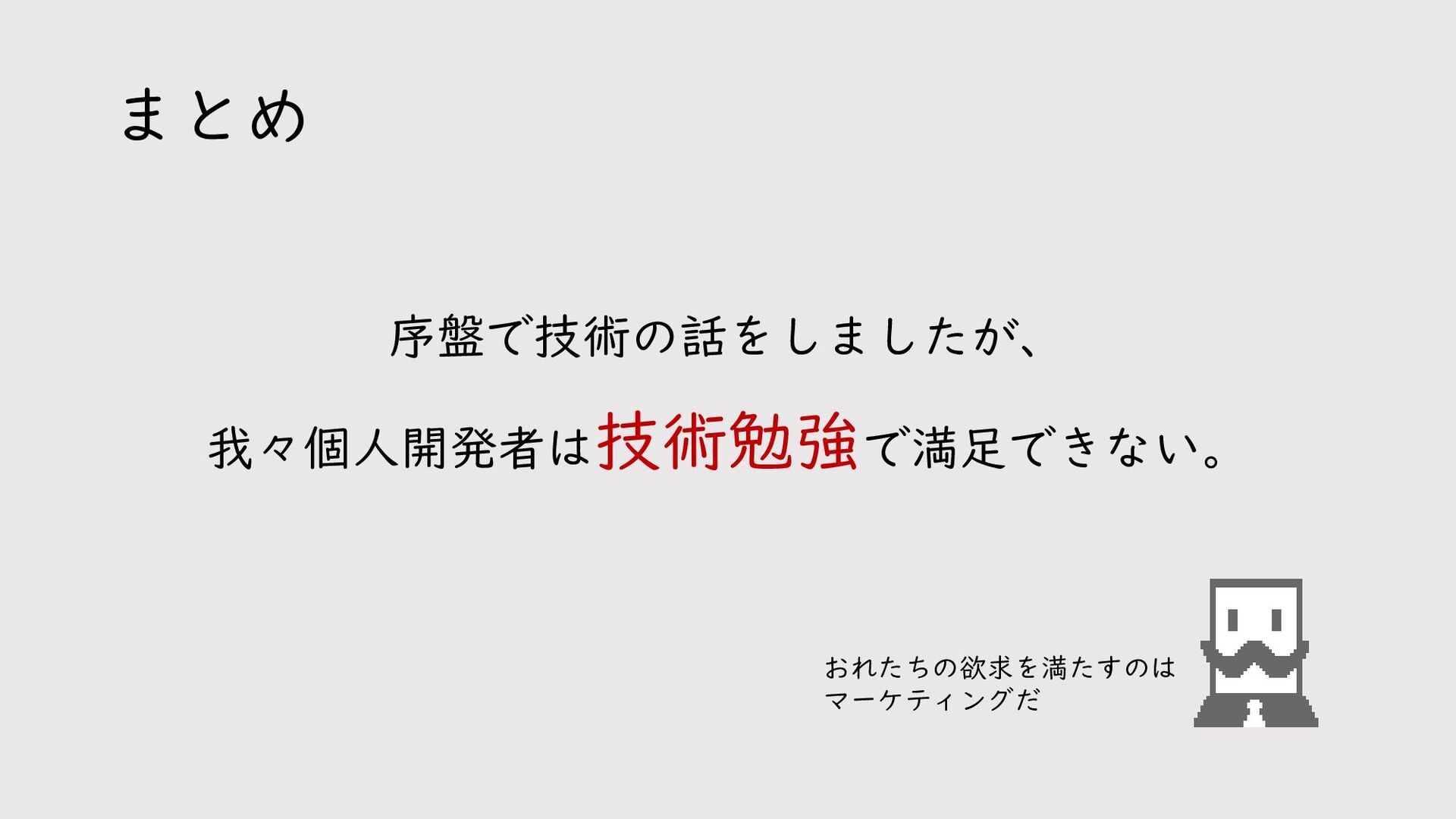 序盤で技術の話をしましたが、 我々個人開発者は技術勉強で満足できない。 おれたちの欲求を満たすのは マーケティングだ まとめ