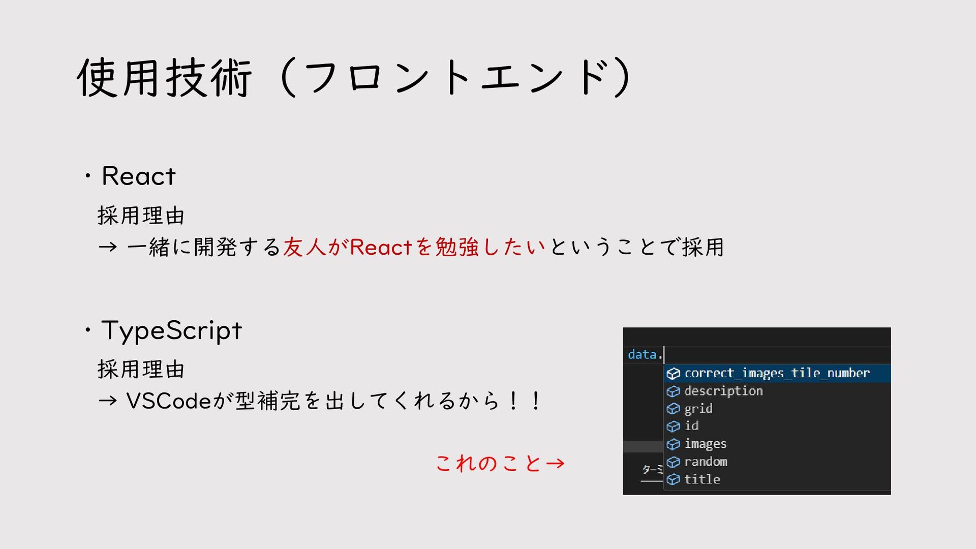 使用技術(フロントエンド) ・React 採用理由 → 一緒に開発する友人がReactを勉強したいということで採用 ・TypeScript 採用理由 → VSCodeが型補完を出してくれるから!! これのこと→